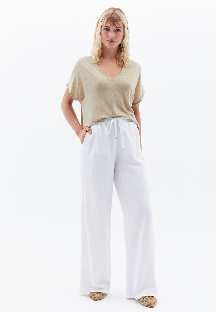 Keten V Yaka Tişört ve Keten Karışımlı Pantolon Kombini