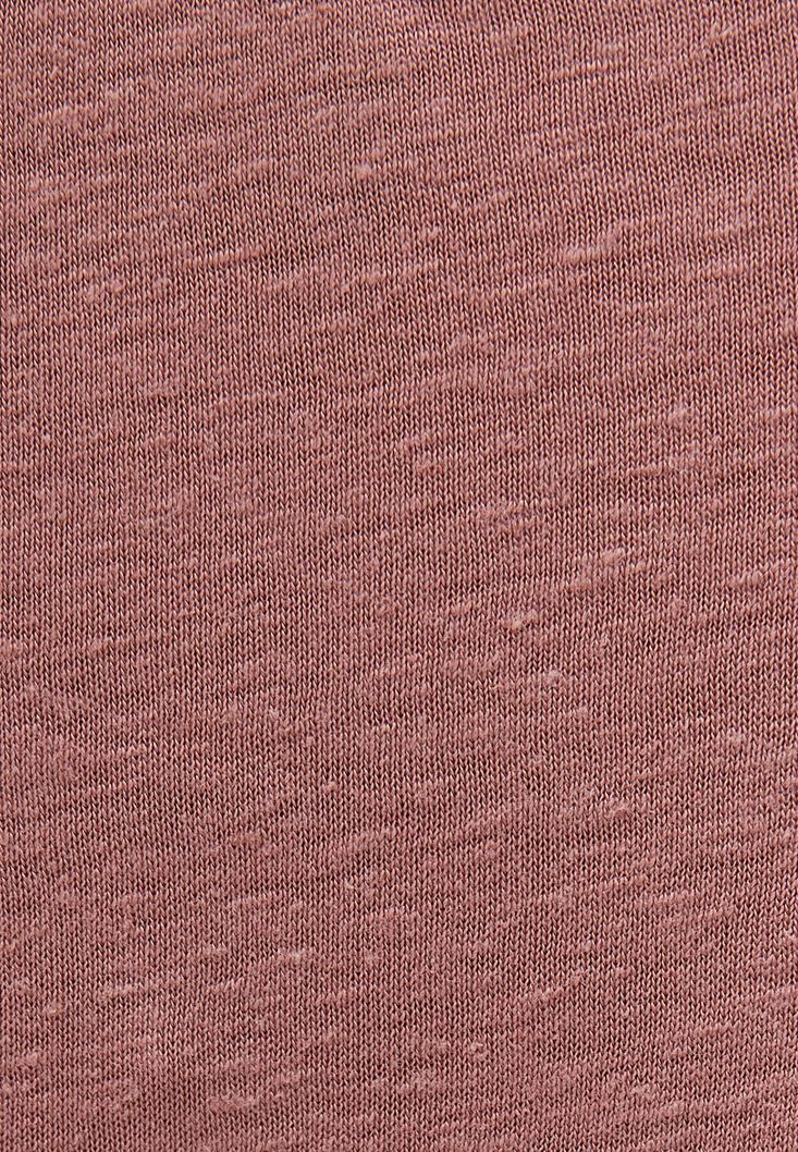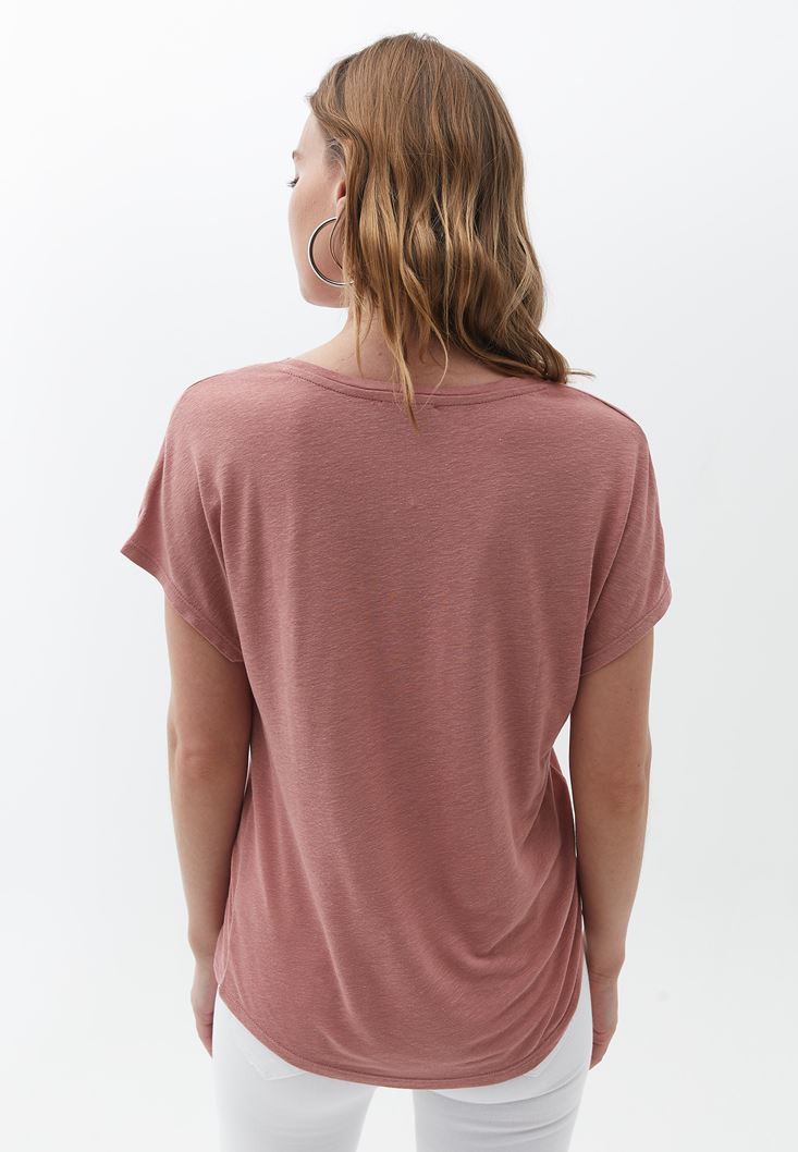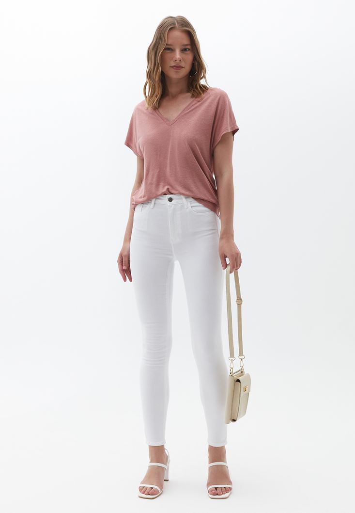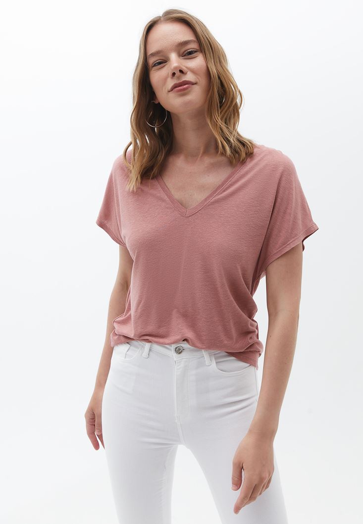 Keten ve viskon karışımlı doğal doku, bedenden uzak fit, V yaka, kısa kollu, standart boy.