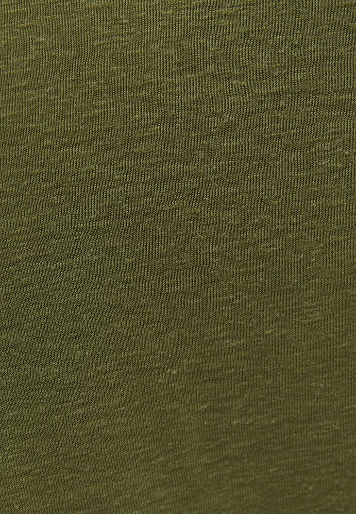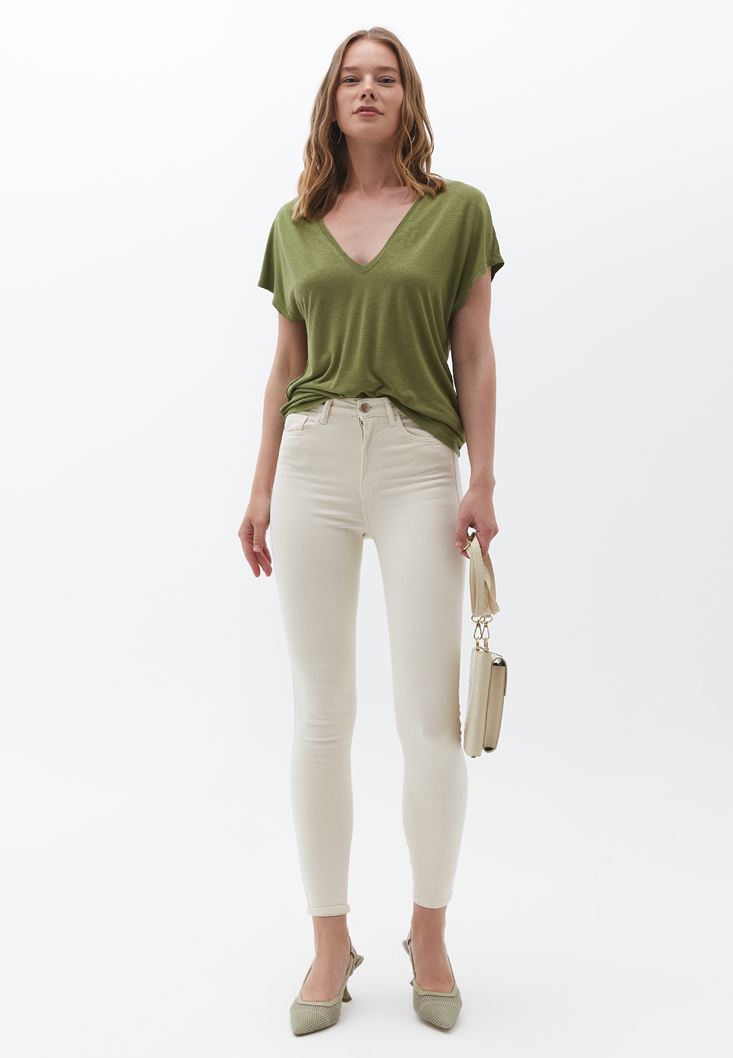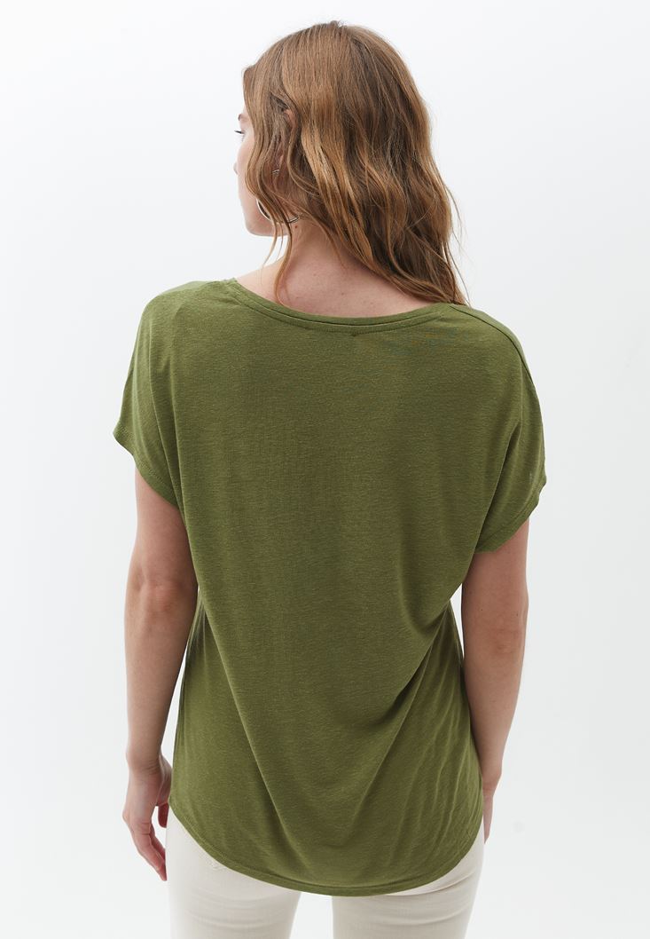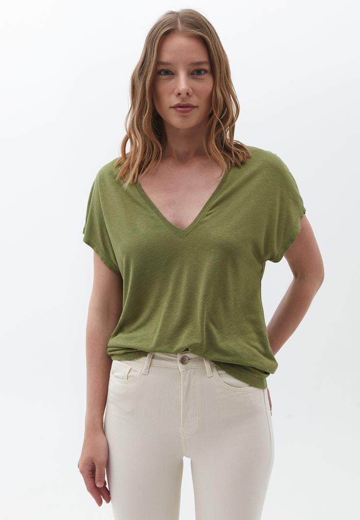 Keten ve viskon karışımlı doğal doku, bedenden uzak fit, V yaka, kısa kollu, standart boy.