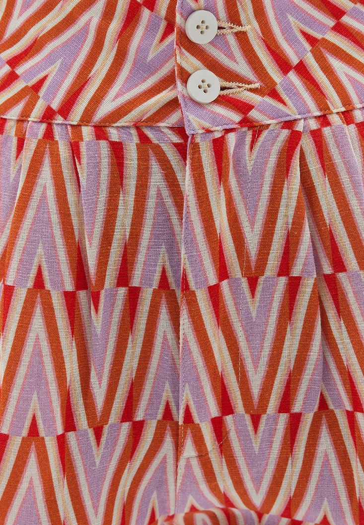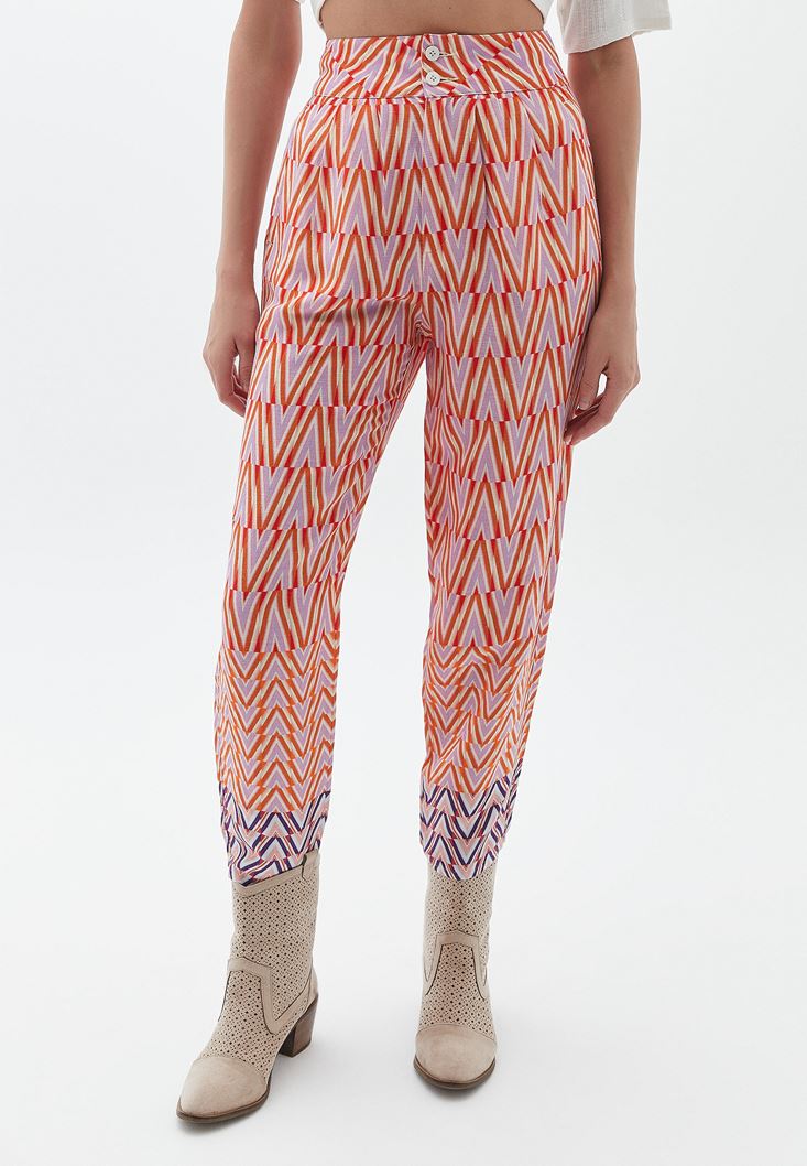 Keten ve viskon karışımlı doku, ultra yüksek bel, desenli tasarım, önü iki cepli, slim paça.
