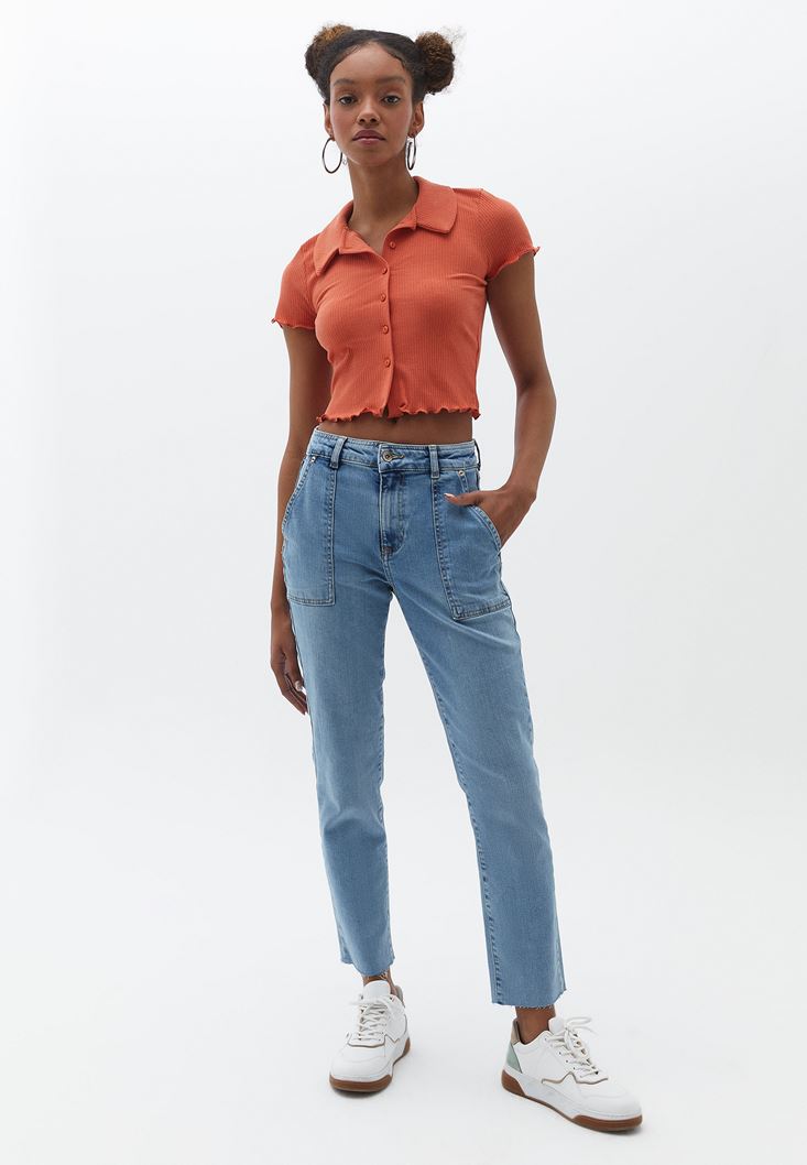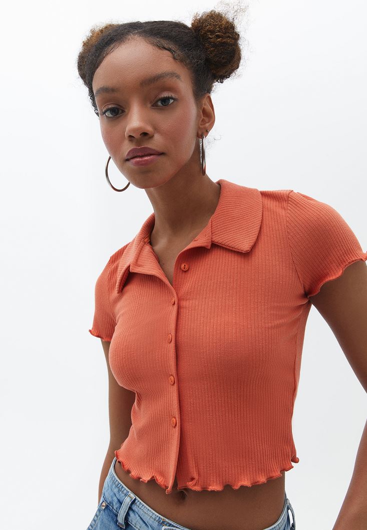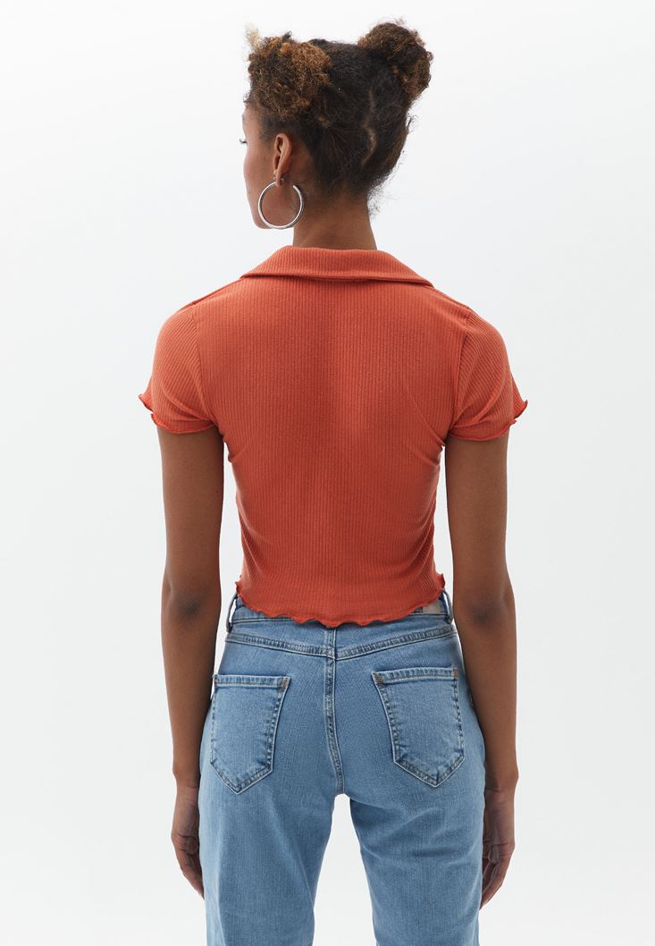 Viskon karışımlı fitilli doku, crop kesim, polo yaka, düğme kapamalı, kısa kollu, bedeni saran esnek fit, kol ve etek ucu kıvrımlı tasarım.
