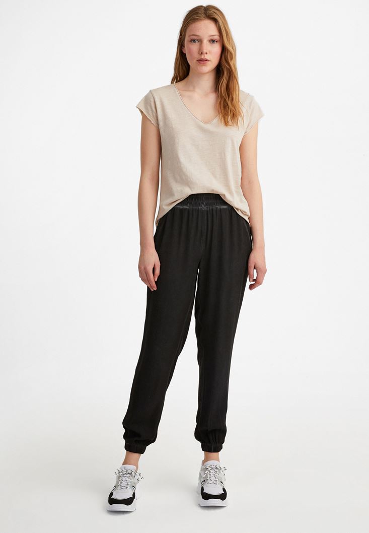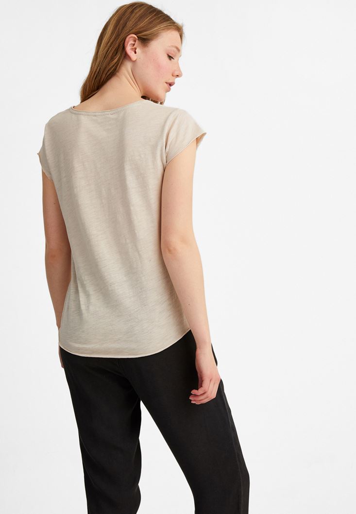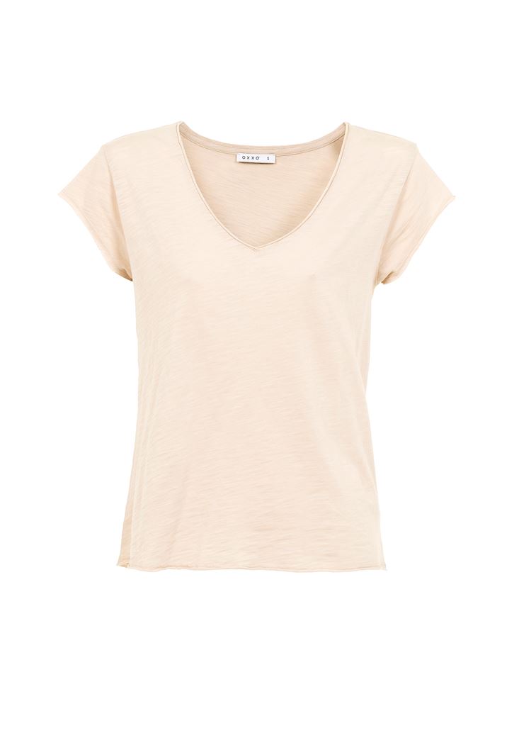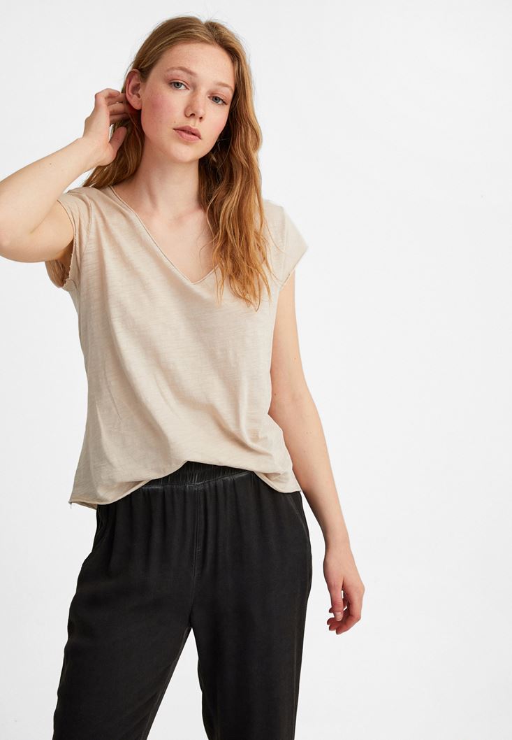 Krem Kısa Kollu V Yaka Tişört