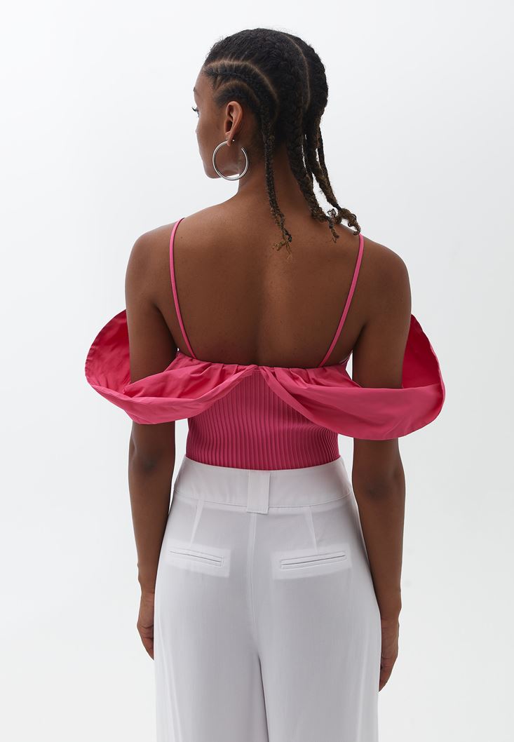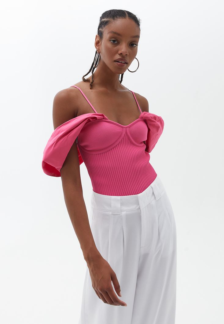 Bedeni saran kısmı triko örgü, kol bölümü garni kumaş, ince askılı, fitilli örgü, kalp yaka, düşük omuz tasarımlı, bedeni saran fit.