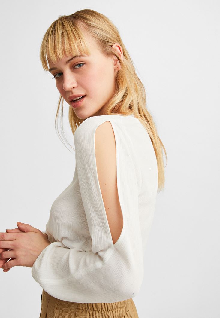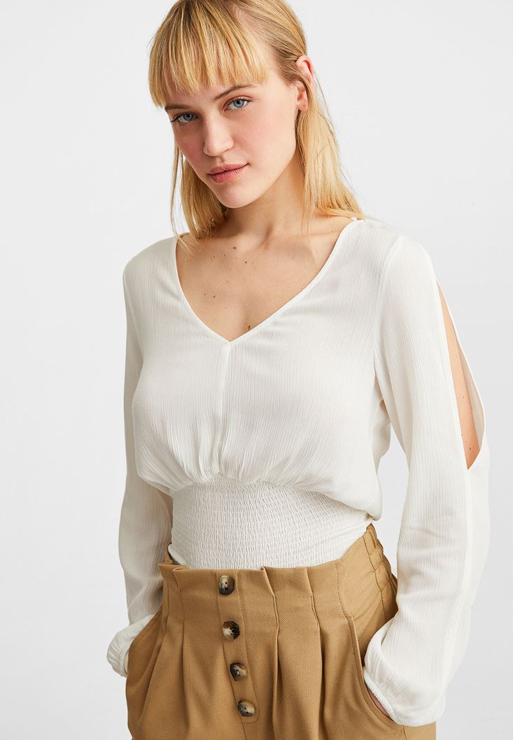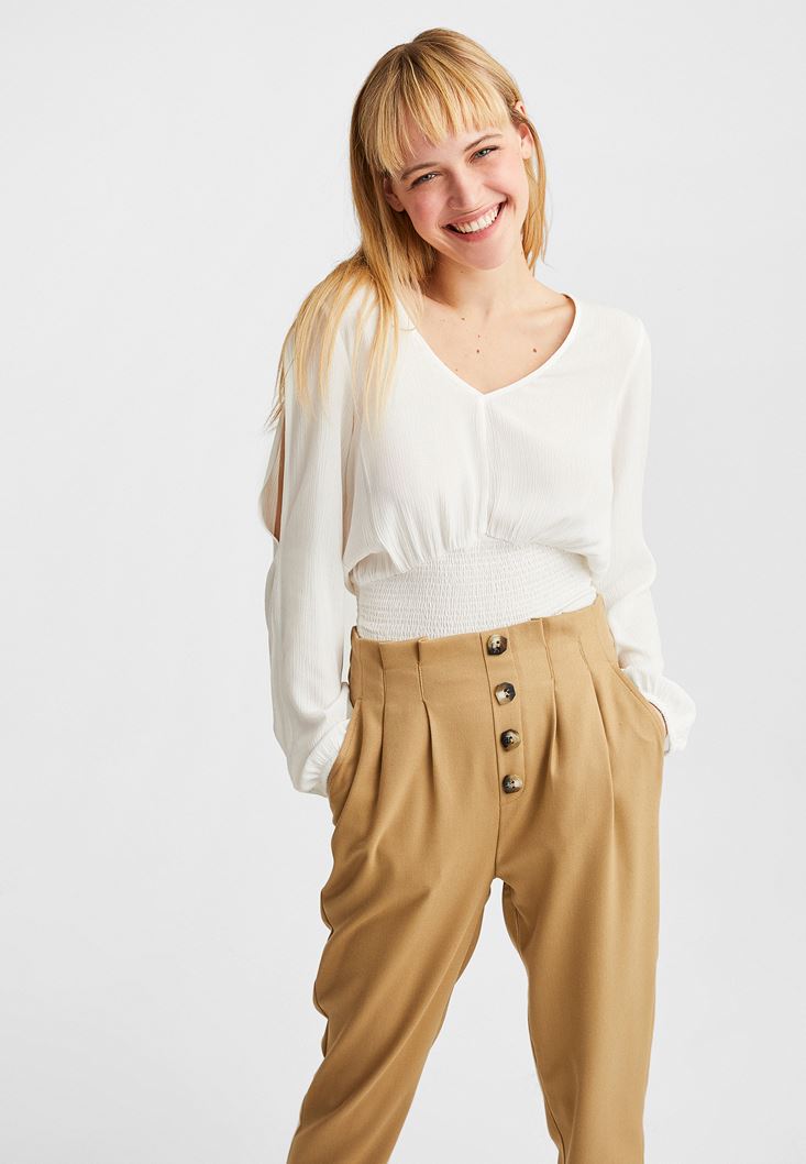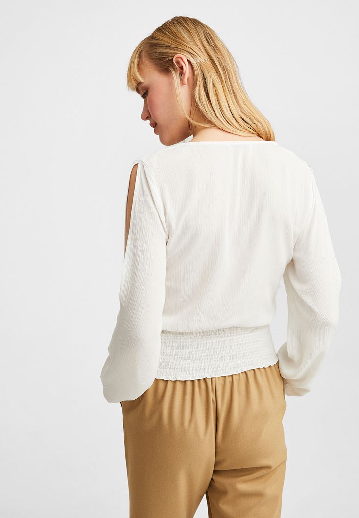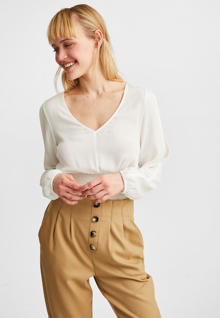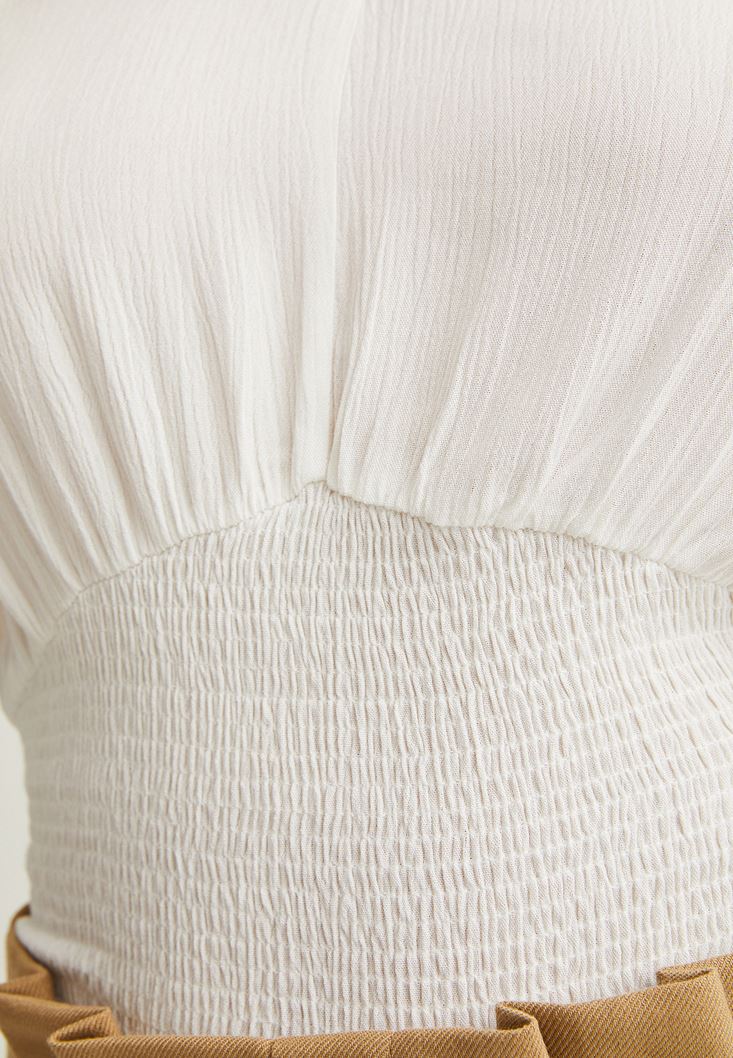 Krem Kol Detaylı Beli Lastikli Bluz