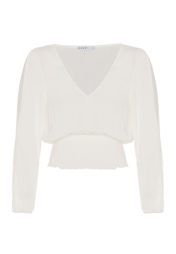 • Bayan Krem Kol Detaylı Beli Lastikli Bluz
