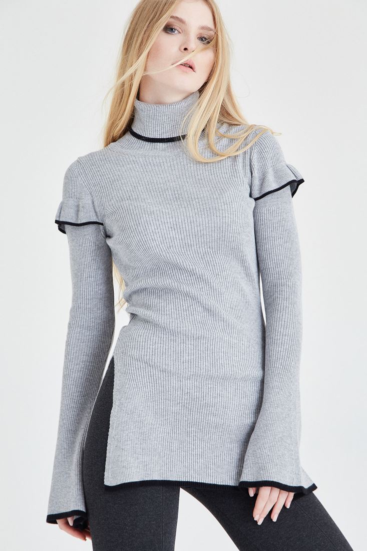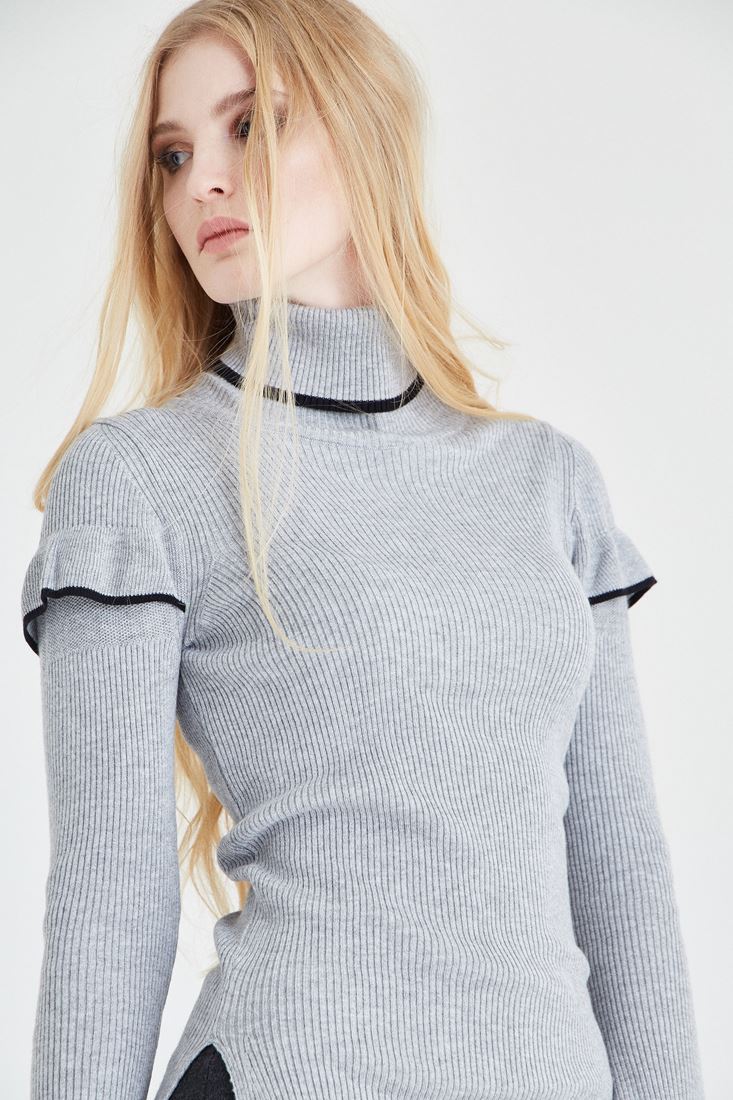 • Bayan Gri Kol Detaylı Boğazlı Kazak