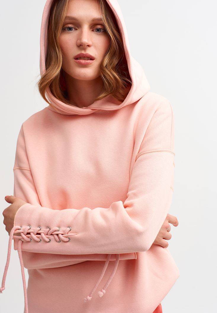 • Bayan Pembe Kol Detaylı Kapüşonlu Sweatshirt