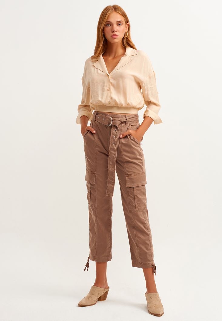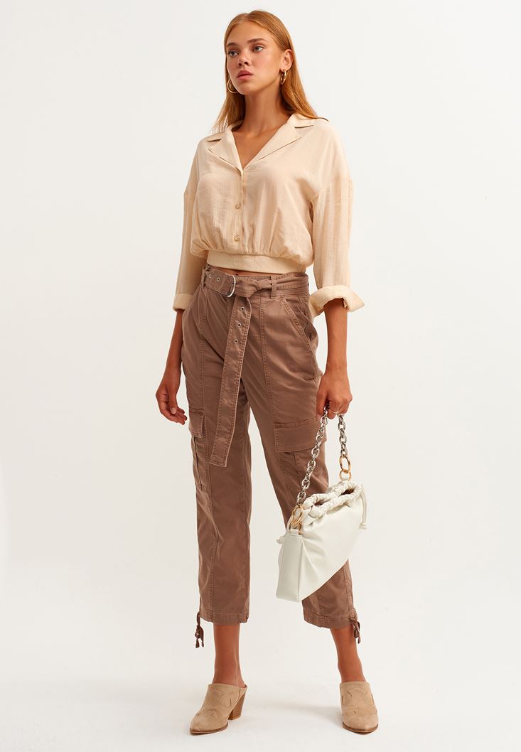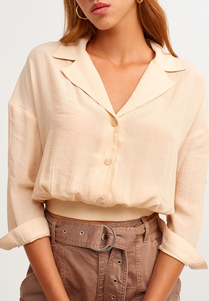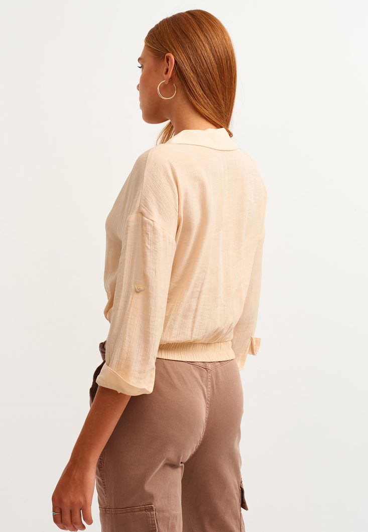 • Bayan Bej Kol Katlamalı Crop Gömlek