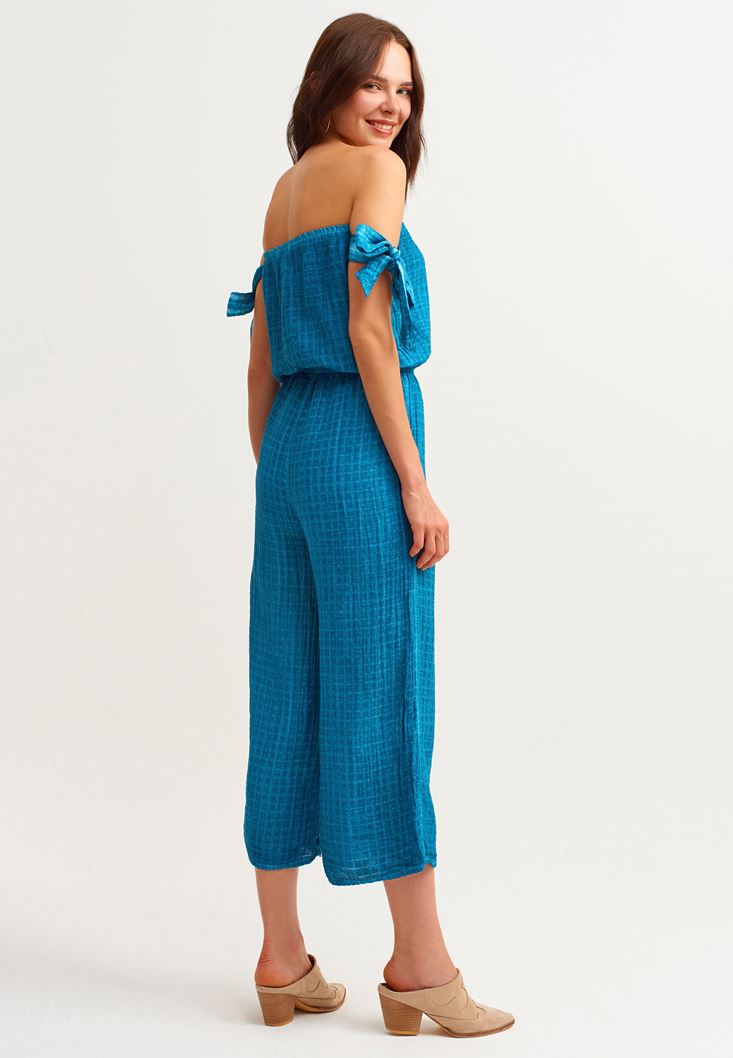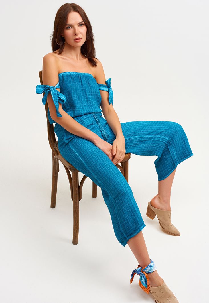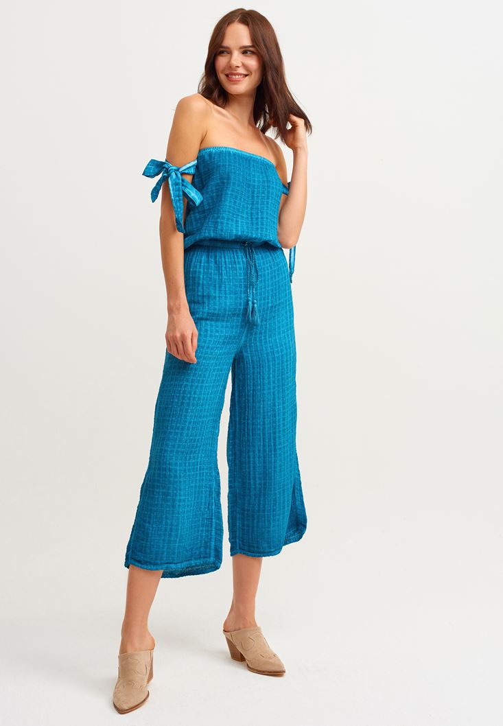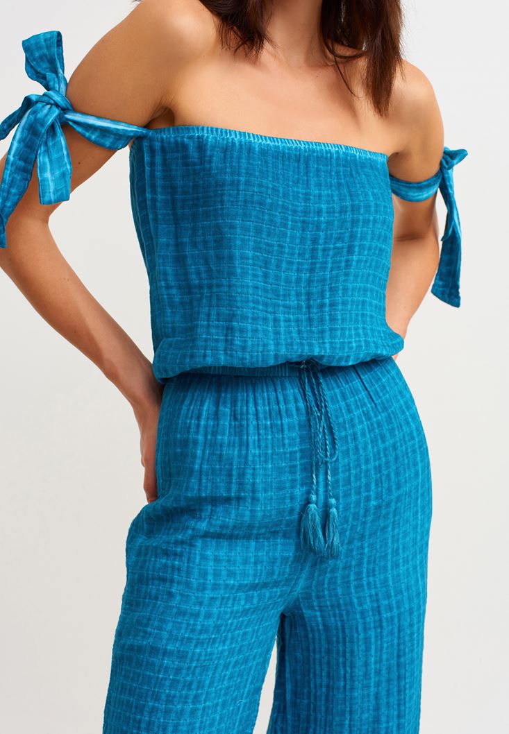 • Bayan Mavi Kolları Bağlama Detaylı Tulum
