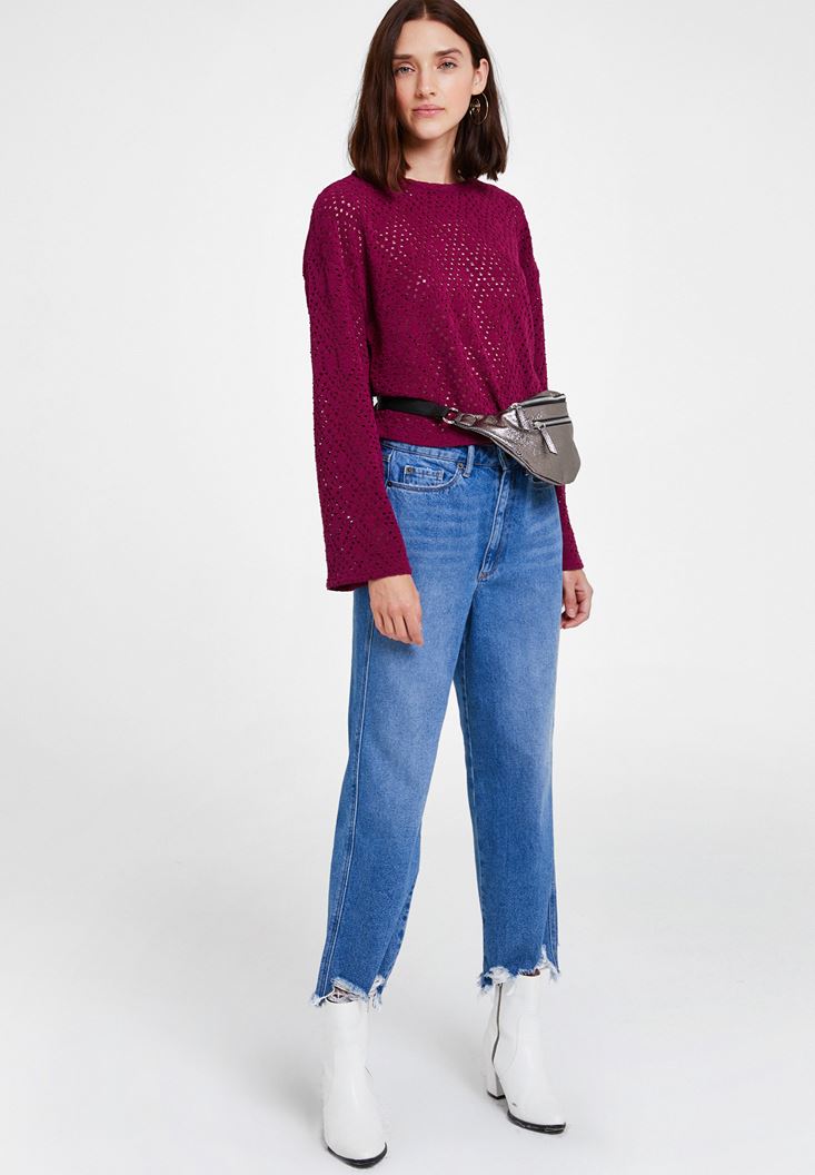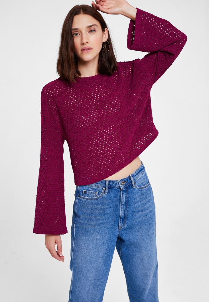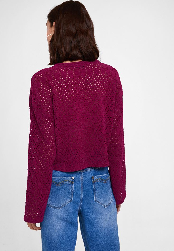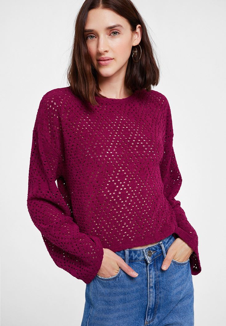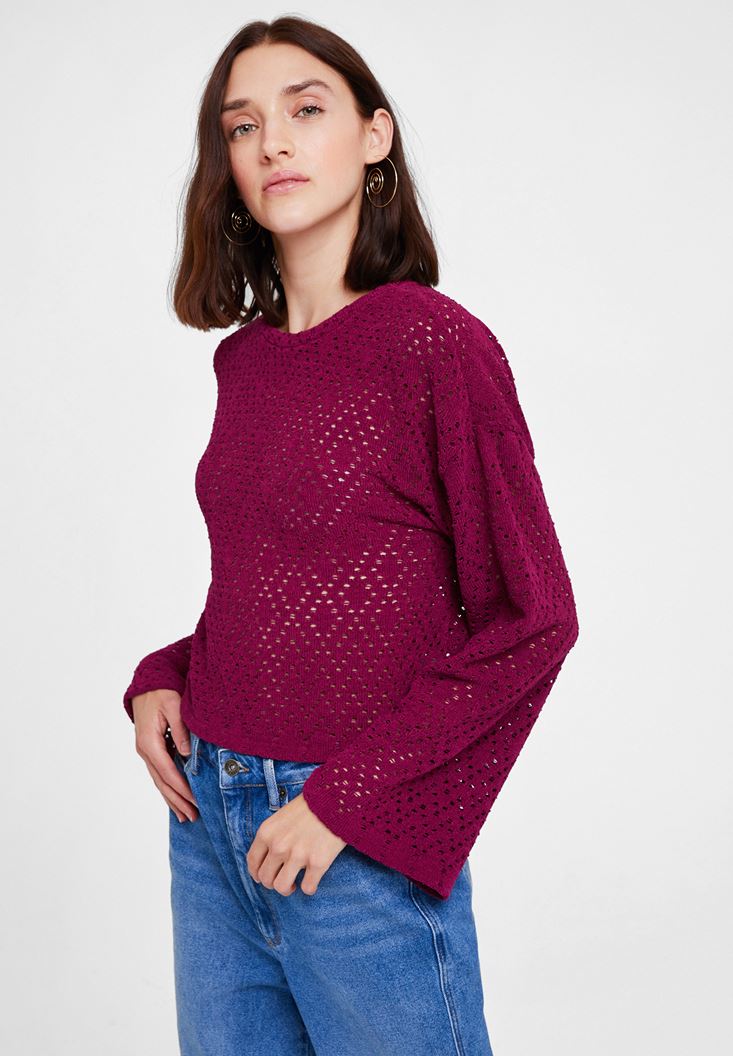 • Bayan Mor Kolları Bol Delik Detaylı Triko