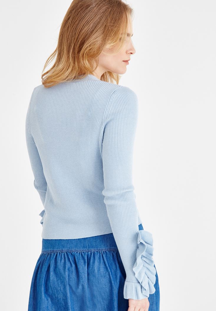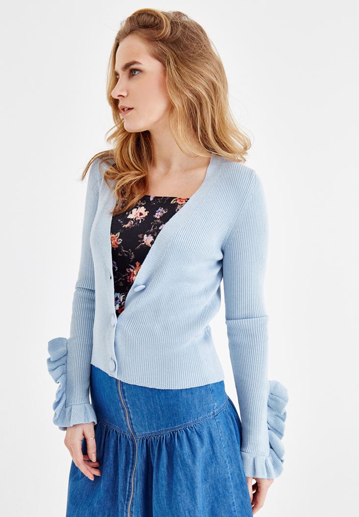 Mavi Kolları Fırfır Detaylı Düğmeli Hırka