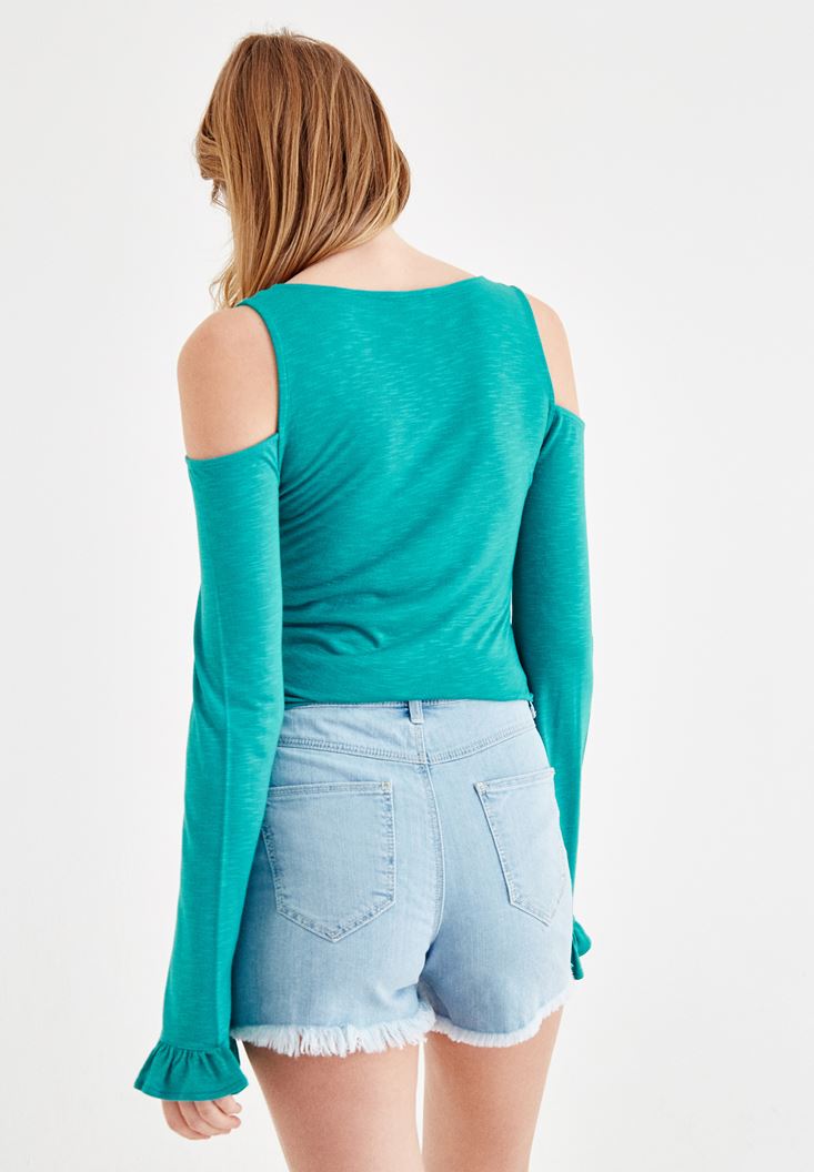 Yeşil Kolları Fırfır Detaylı Tişört