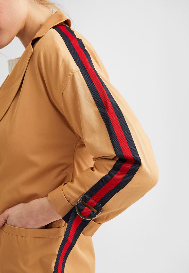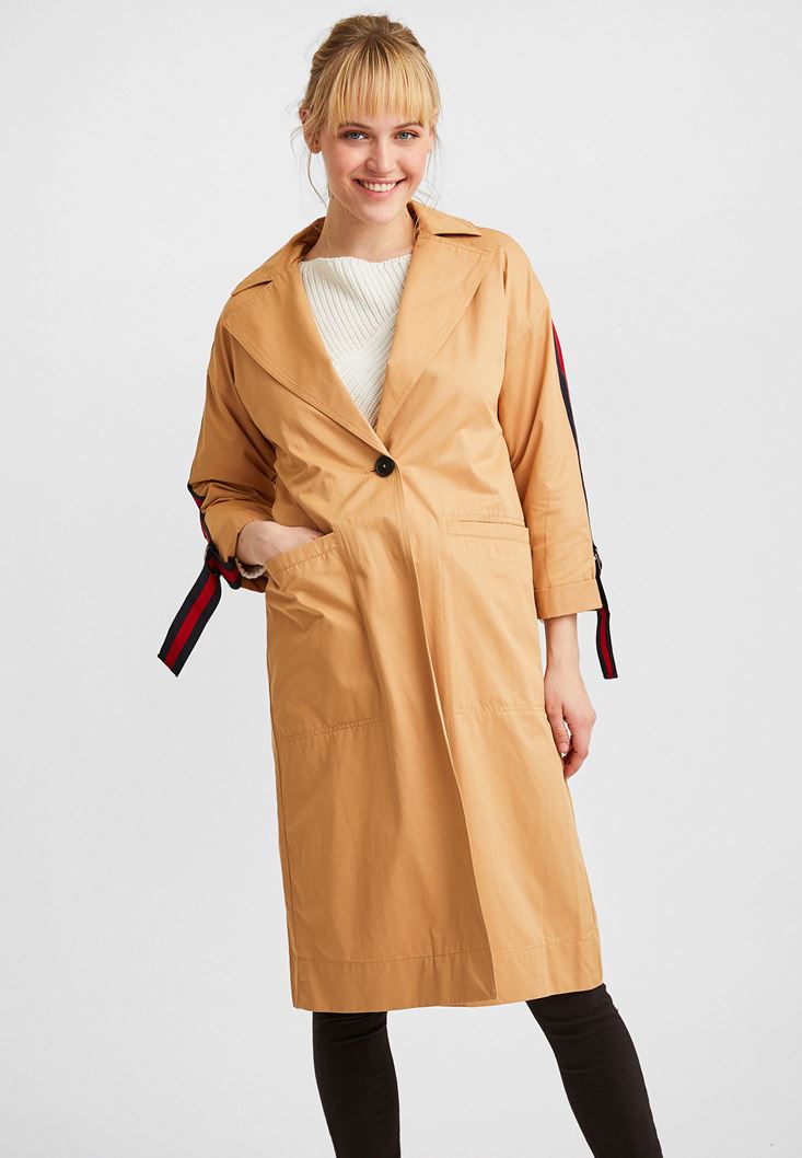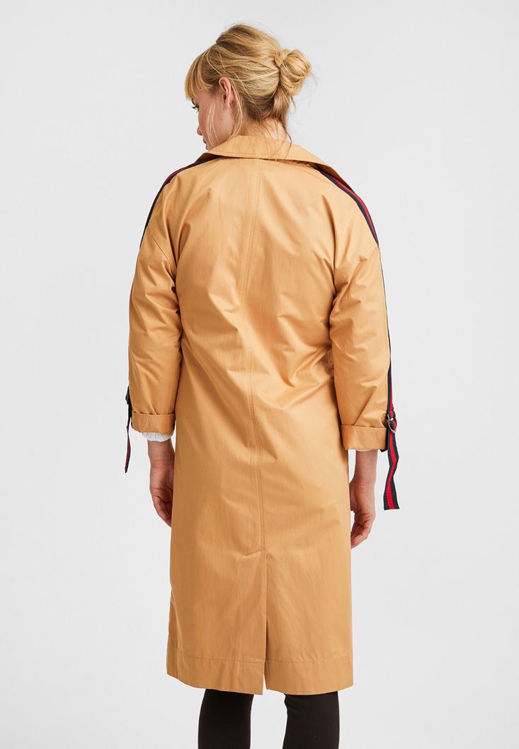 Kahverengi Kolları Şeritli Trençkot