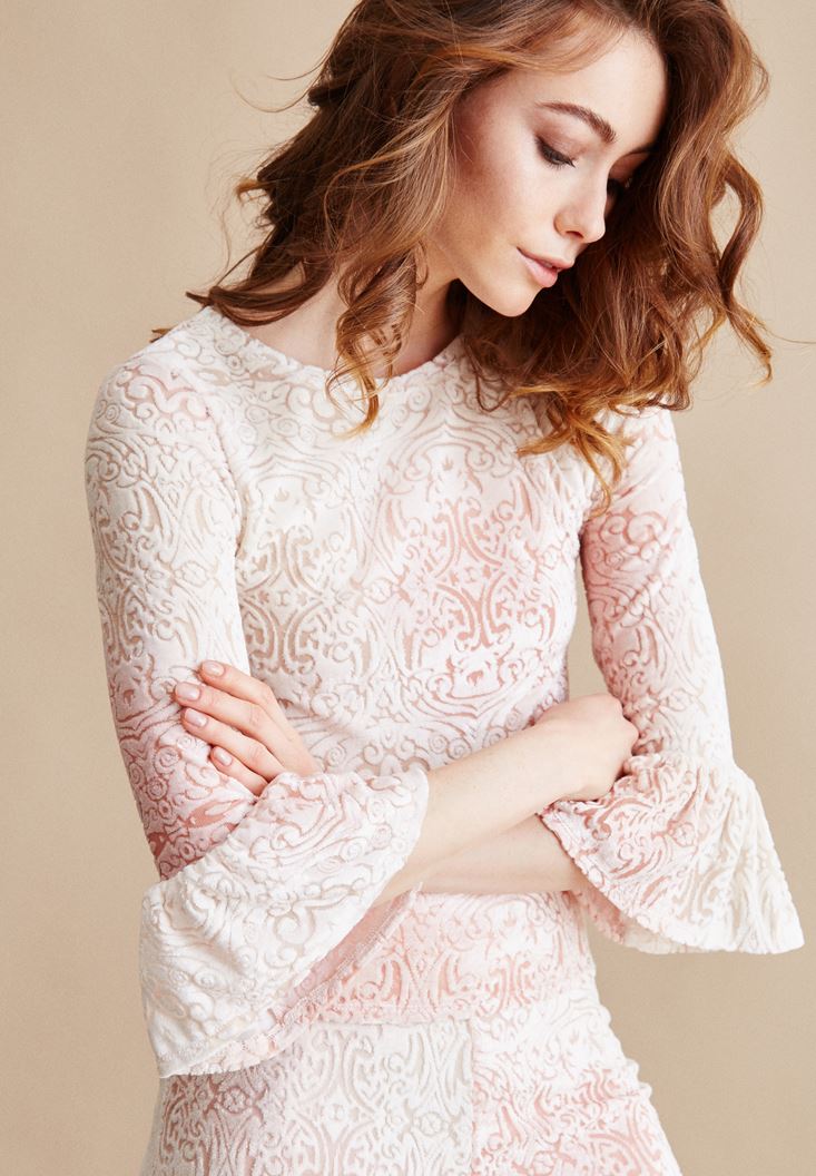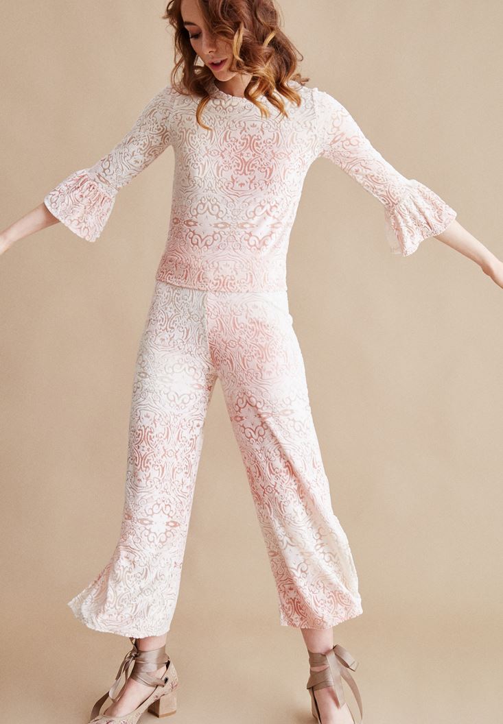 • Bayan Pembe Kolları Volanlı Desen Baskılı Kadife Bluz