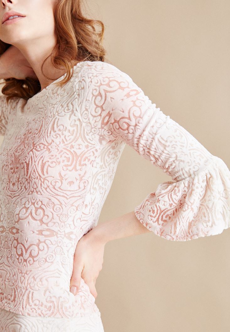 Pembe Kolları Volanlı Desen Baskılı Kadife Bluz