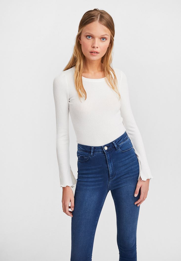 • Bayan Krem Kolları Yırtmaç Detaylı Bot Yaka Triko