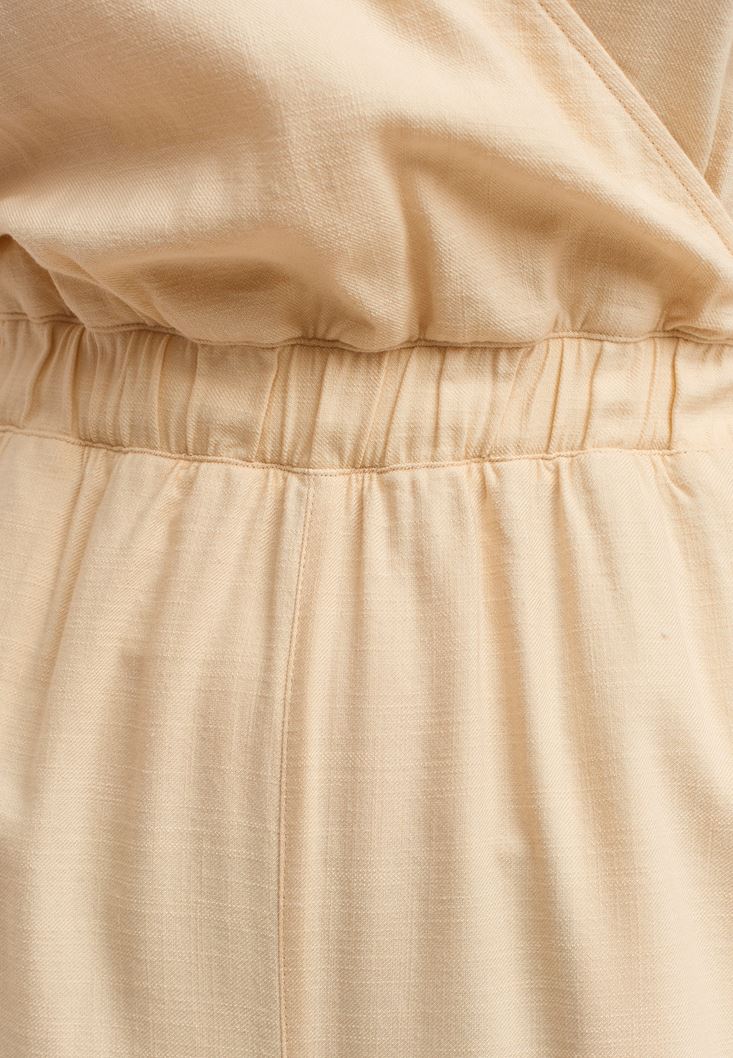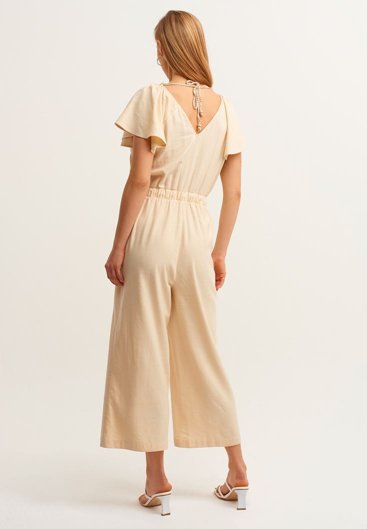 Pamuk ve viskon karışımlı özel doku, kruvaze yaka, beli lastikli, iki cepli, culotte kesim geniş paça, kelebek kol, sırt kısmı bağcık detaylı.