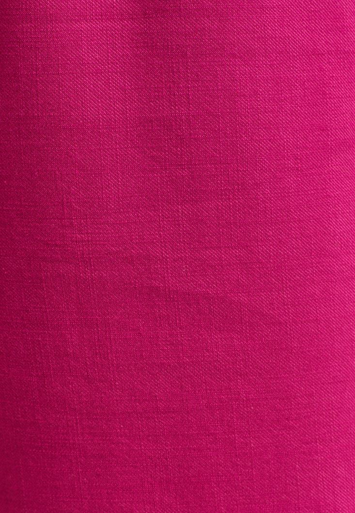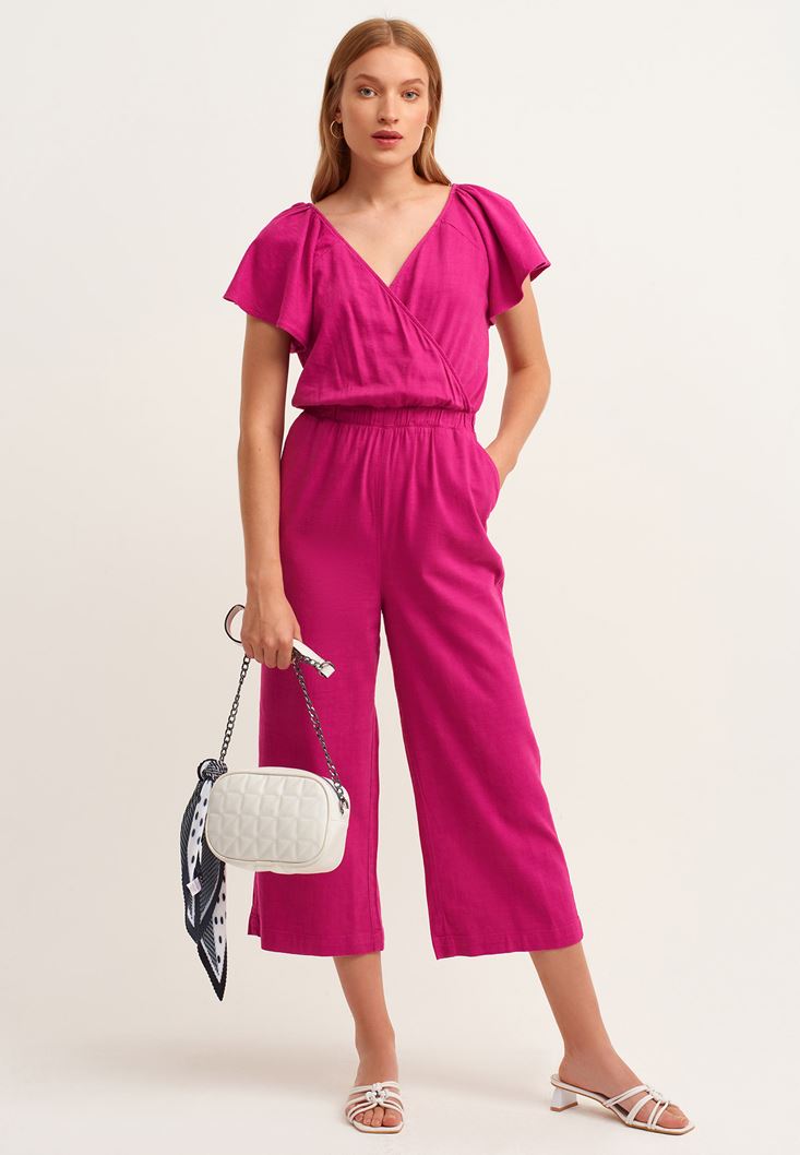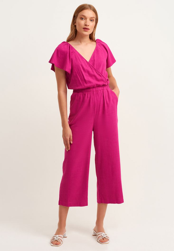 Pamuk ve viskon karışımlı özel doku, kruvaze yaka, beli lastikli, iki cepli, culotte kesim geniş paça, kelebek kol, sırt kısmı bağcık detaylı.