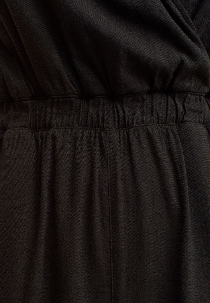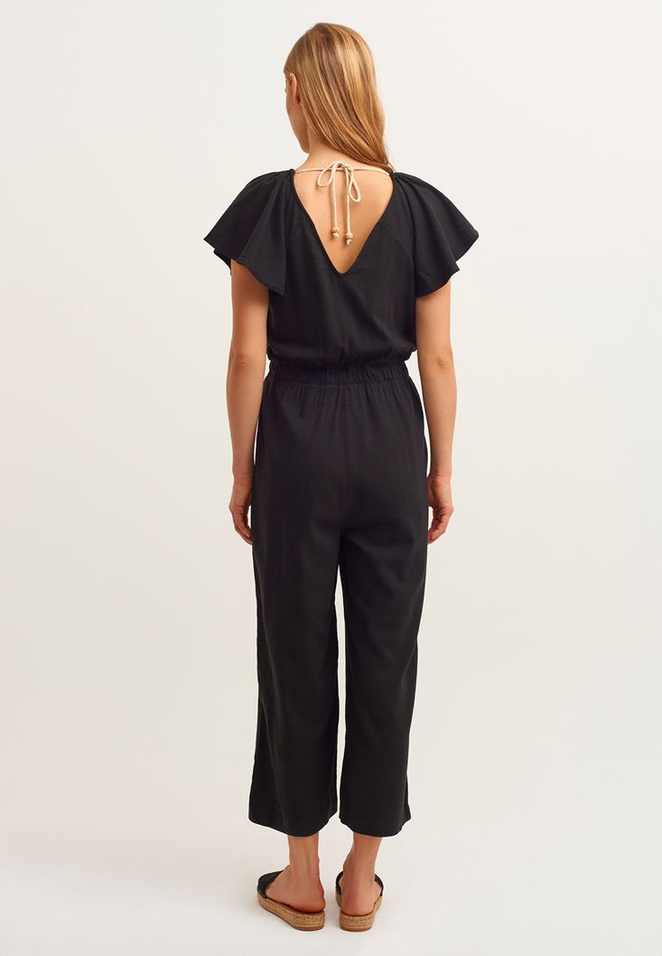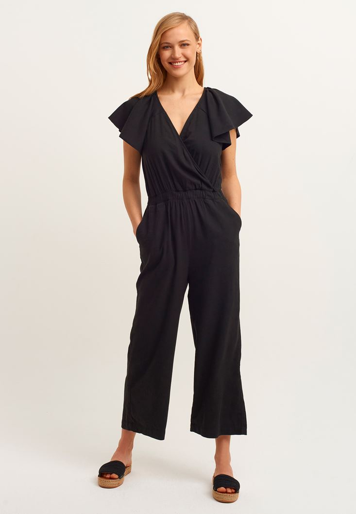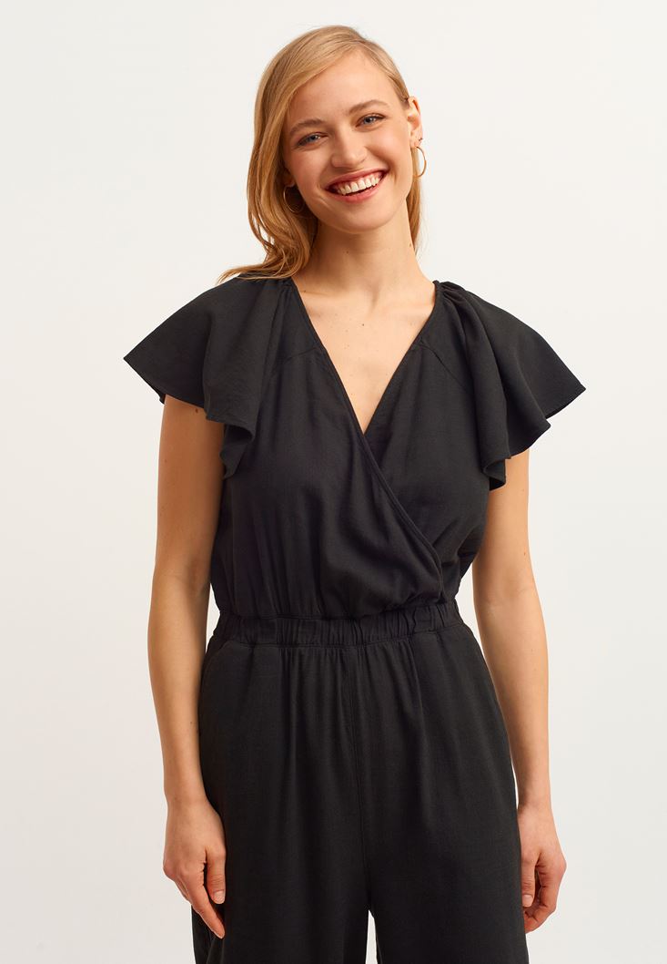 Pamuk ve viskon karışımlı özel doku, kruvaze yaka, beli lastikli, iki cepli, culotte kesim geniş paça, kelebek kol, sırt kısmı bağcık detaylı.