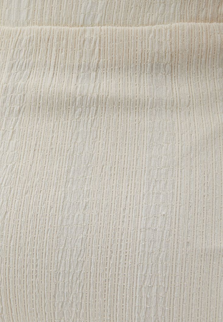 Dokulu özel kumaş, yüksek bel, maxi boy, beli bağlamalı ve lastikli, bedeni saran fit, kruvaze kesim, içi astarlı.