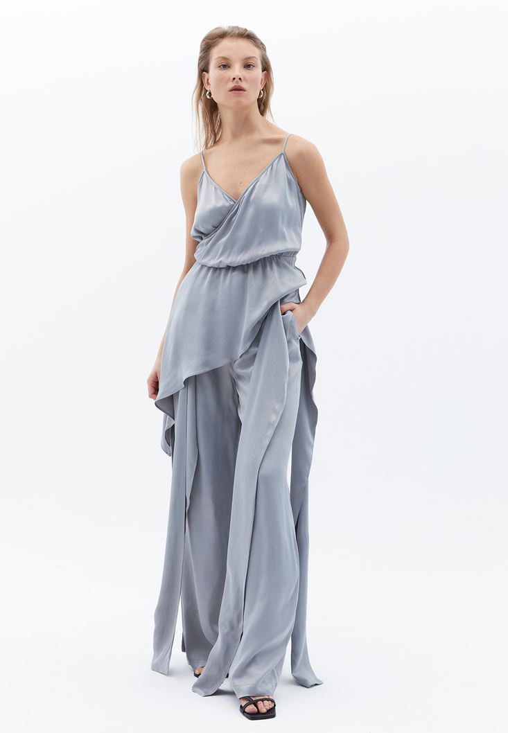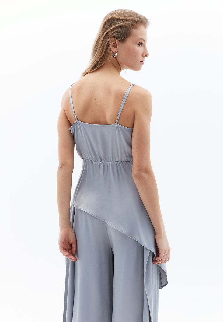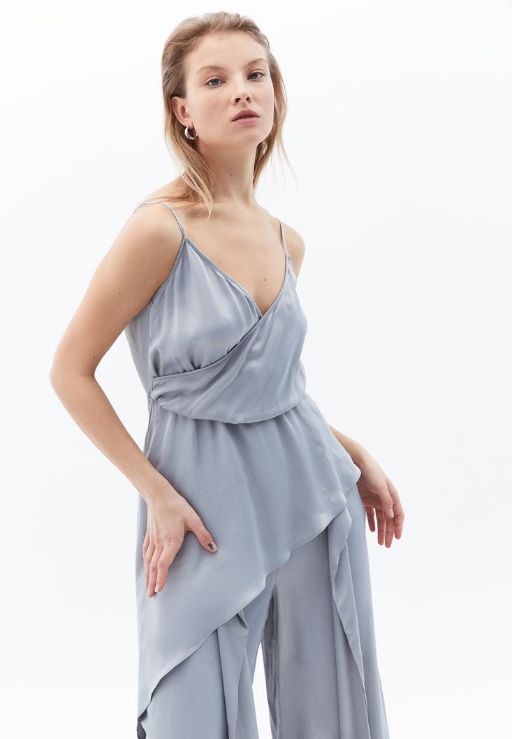 %100 viskon içerikli saten doku, bedenden uzak loose fit, kruvaze yaka, asimetrik kesim, ayarlanabilir ince askılı, beli lastikli.