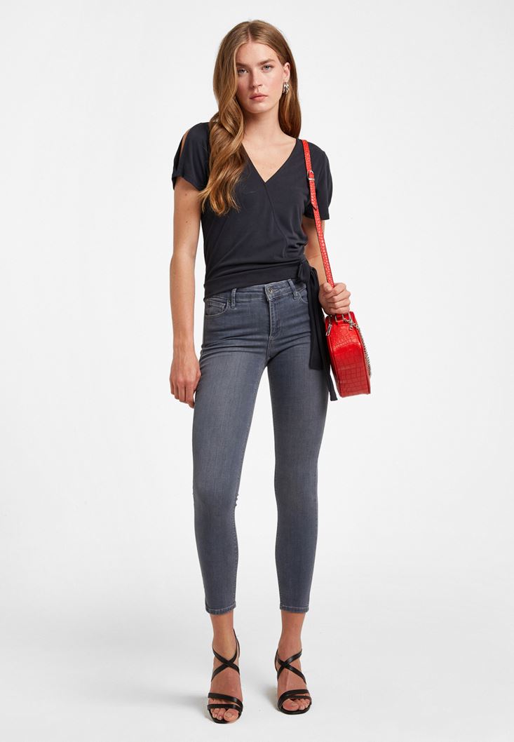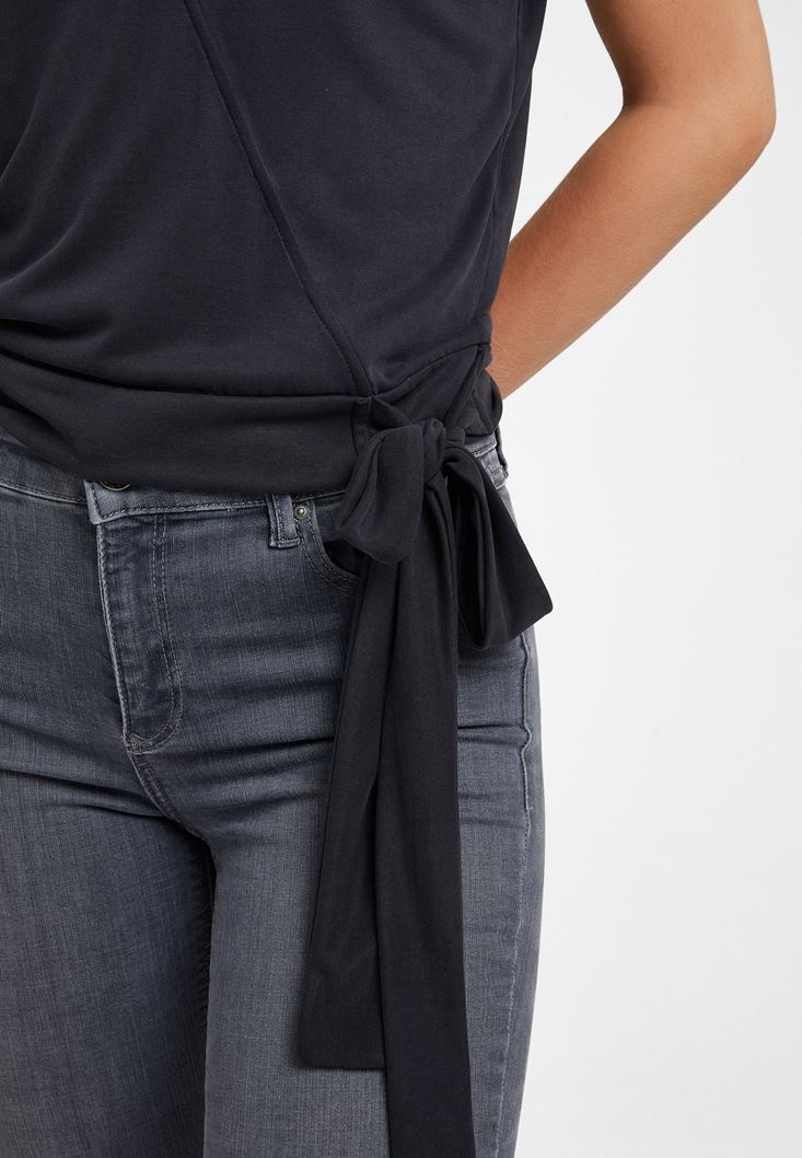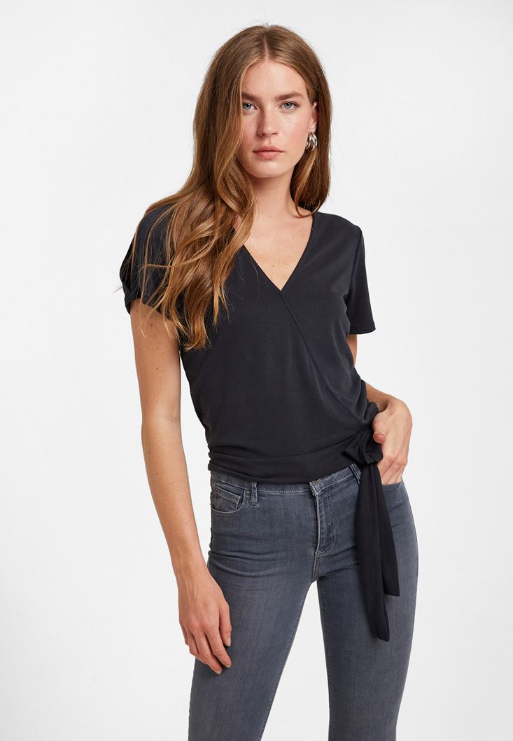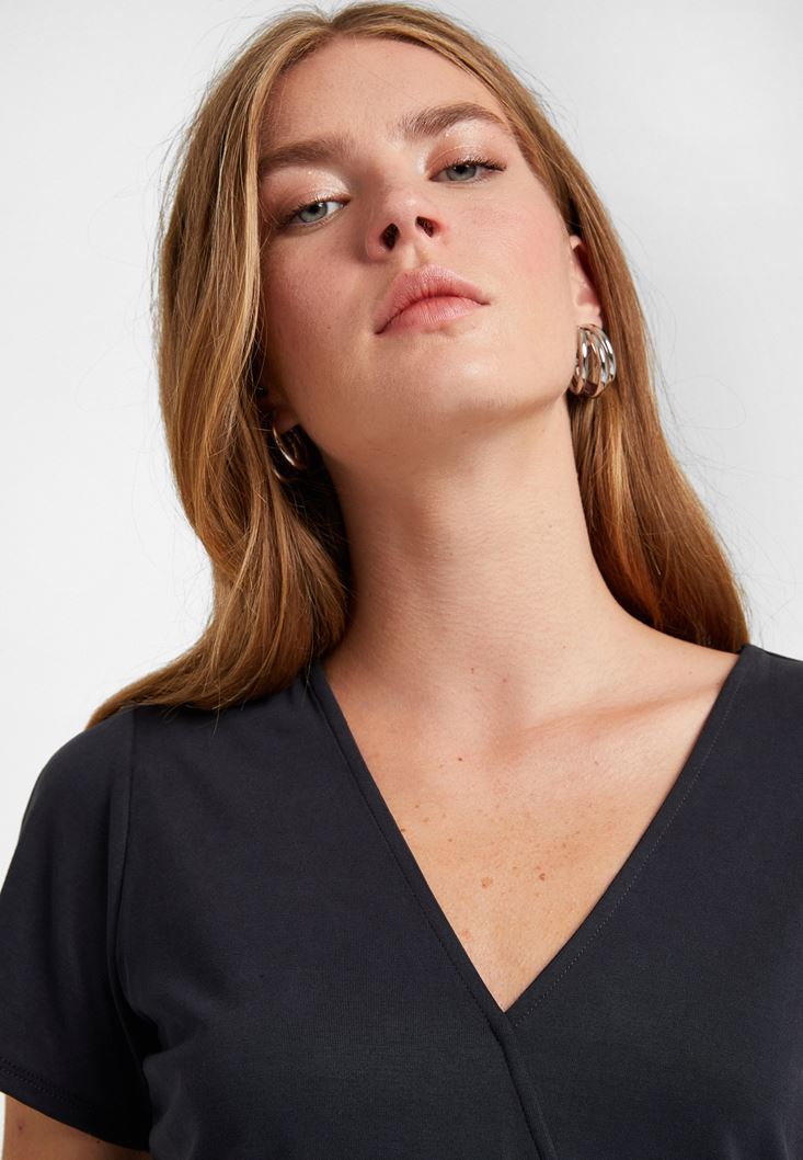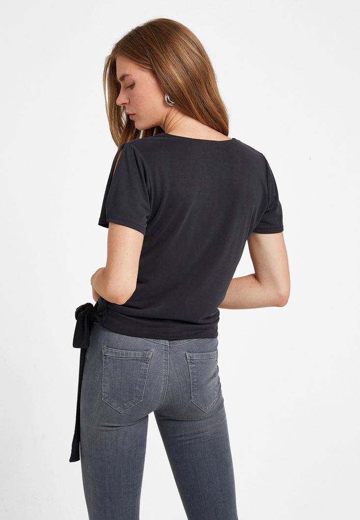 • Bayan Siyah Kruvaze Yaka Bağlamalı Tişört