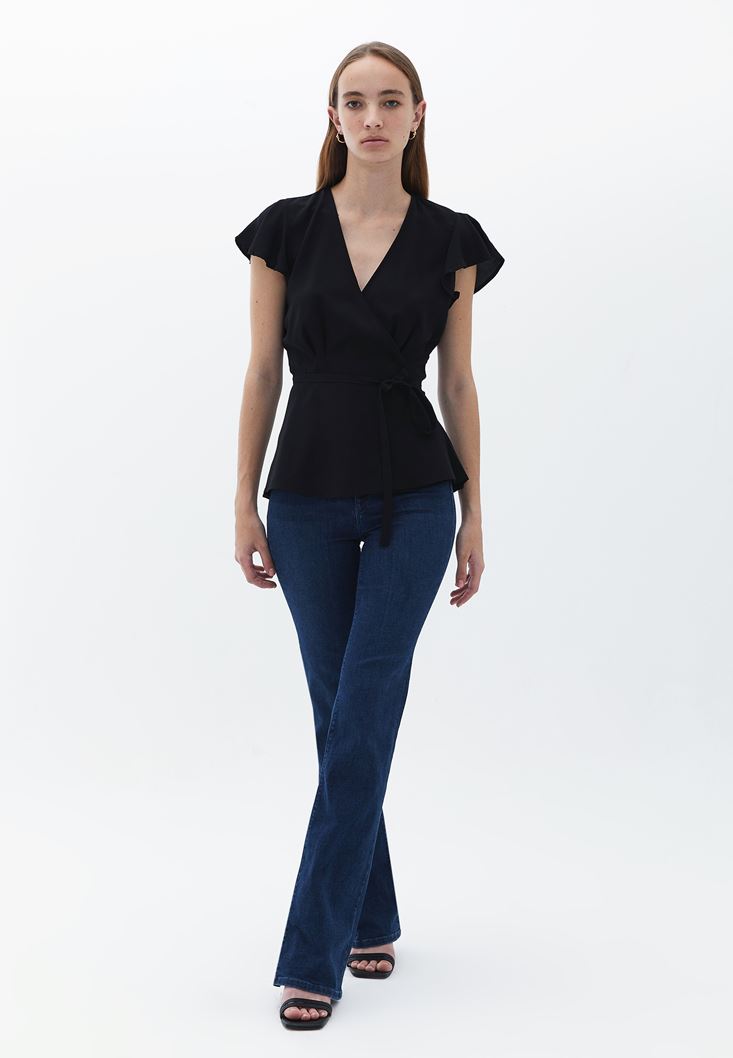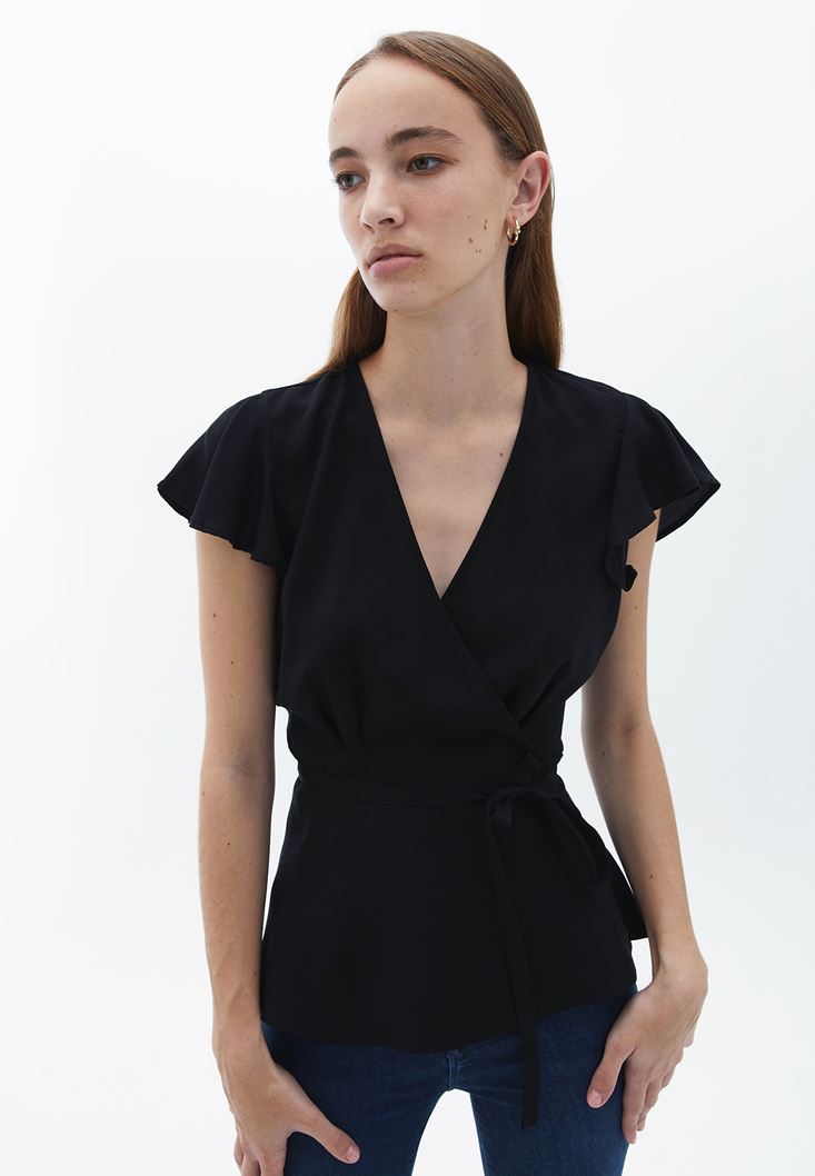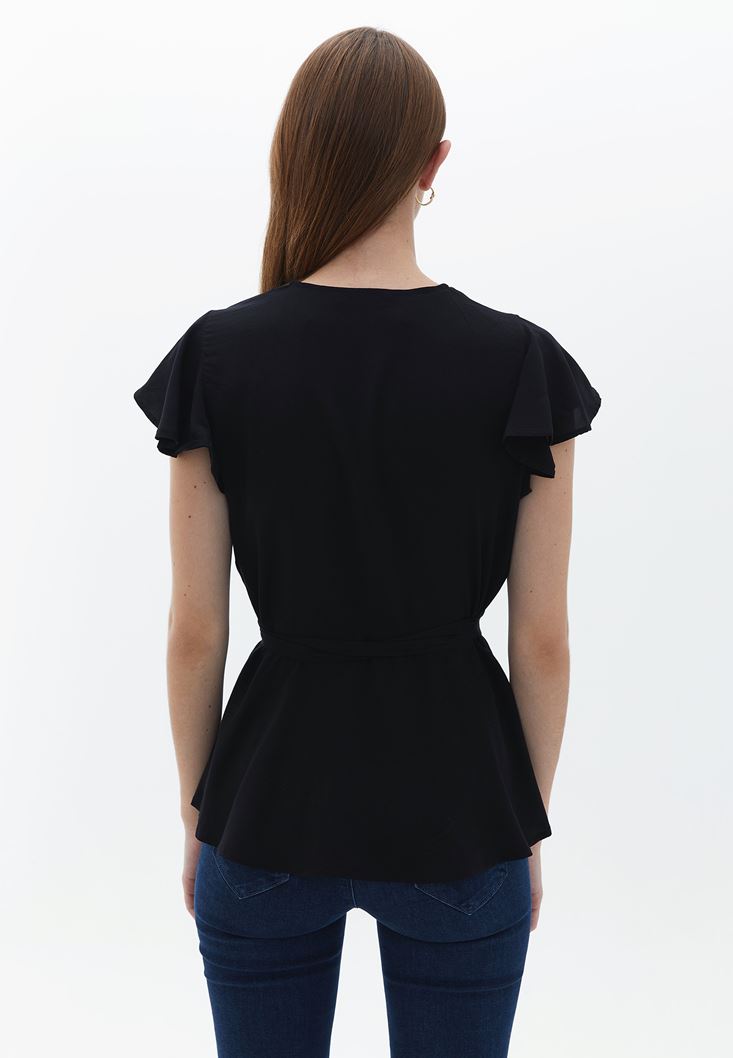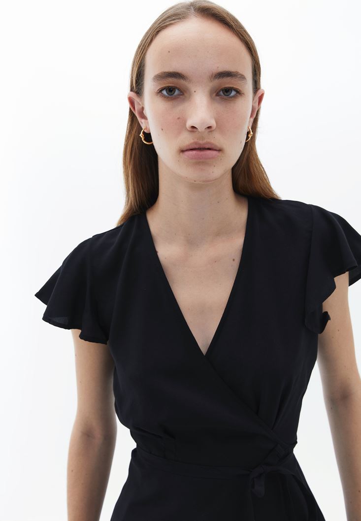 %100 viskon içerikli doku, bedenden uzak rahat fit, kruvaze yaka, beli bağcıklı, kısa kollu, önü kısa arkası uzun asimetrik kesim.