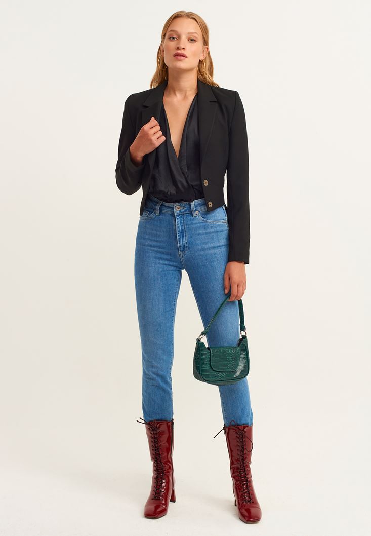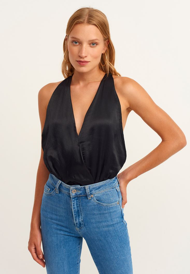 • Bayan Siyah Kruvaze Yaka Bodysuit