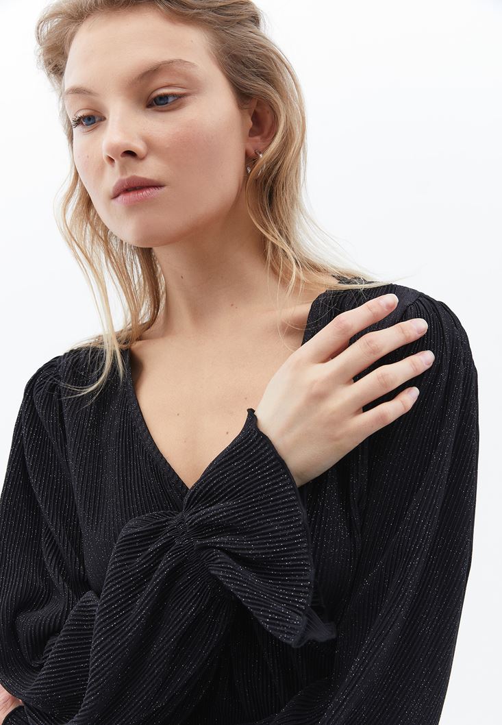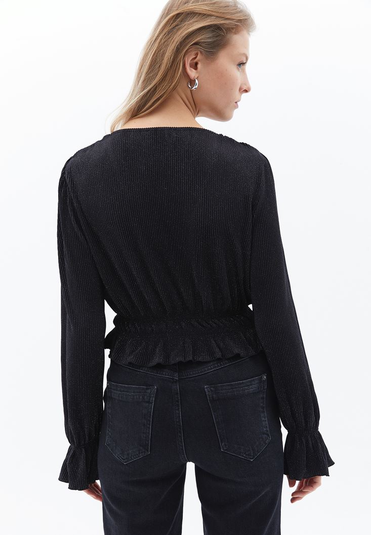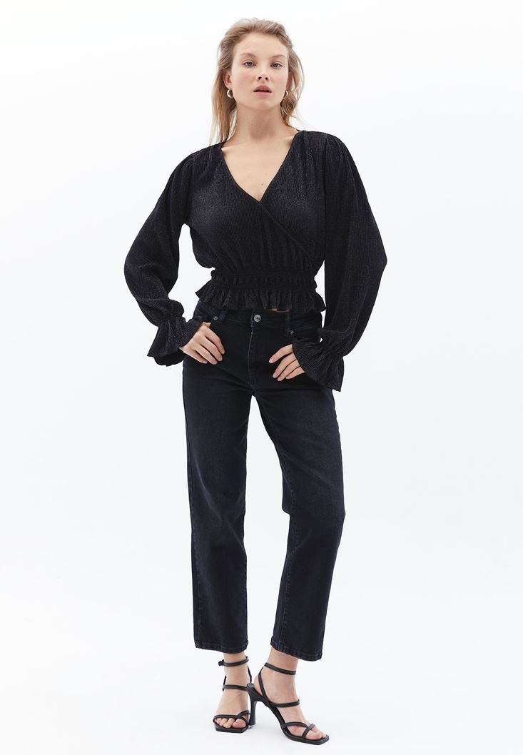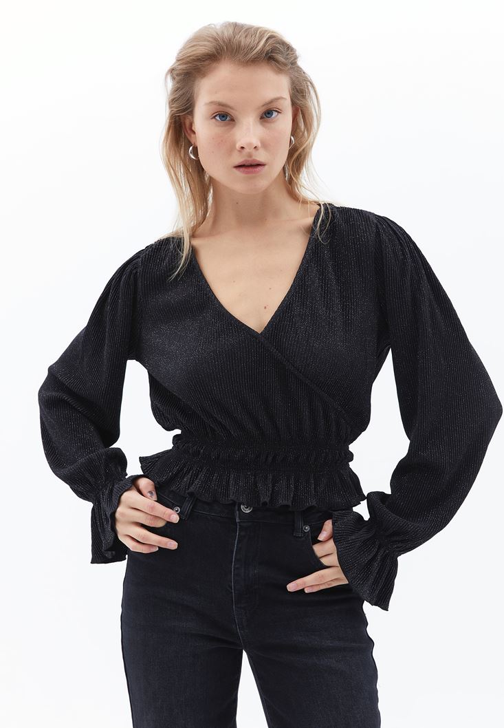 Siyah Kruvaze Yaka Crop Bluz