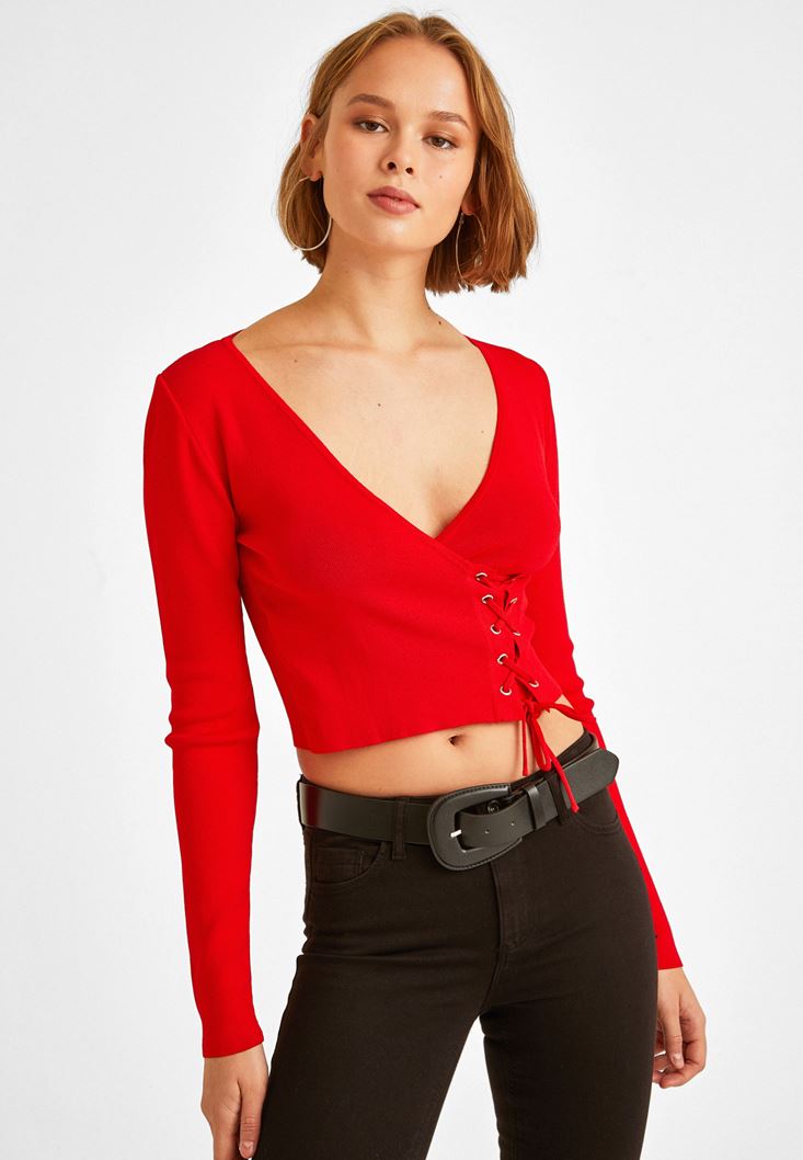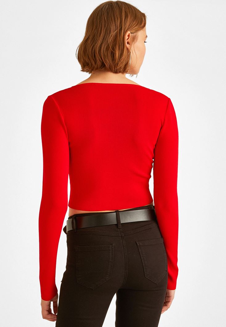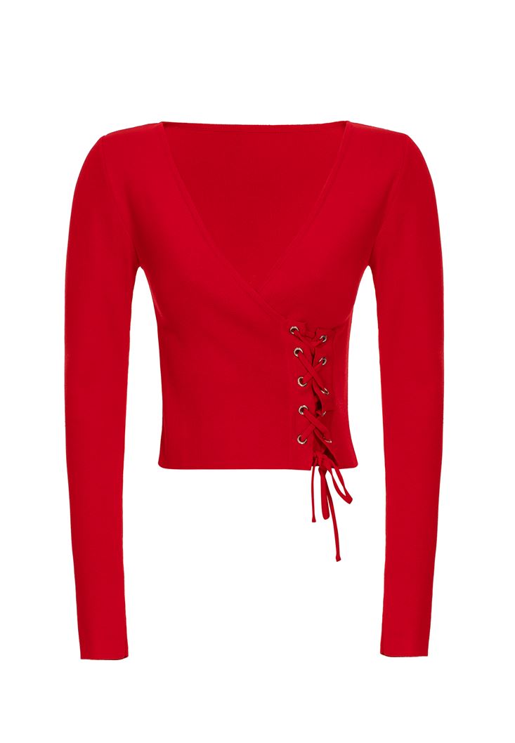 • Bayan Kırmızı Kruvaze Yaka Kazak