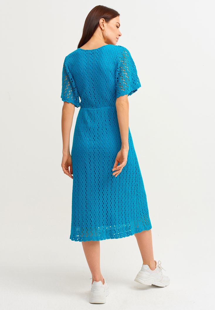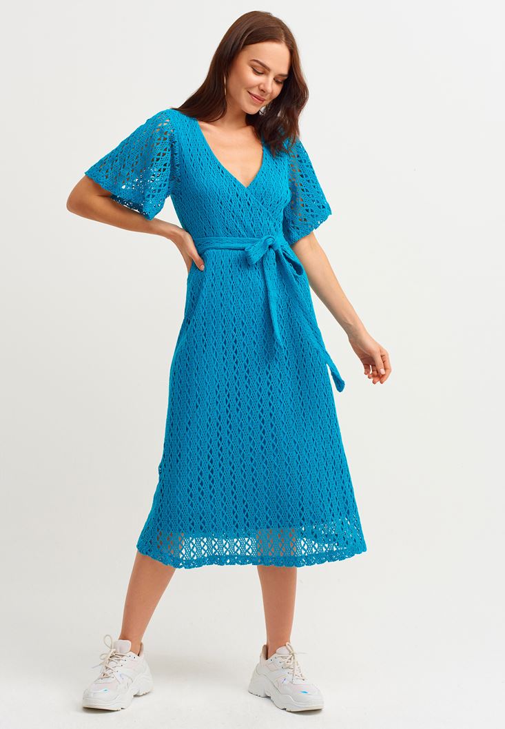 Mavi Kruvaze Yaka Midi Boy Elbise