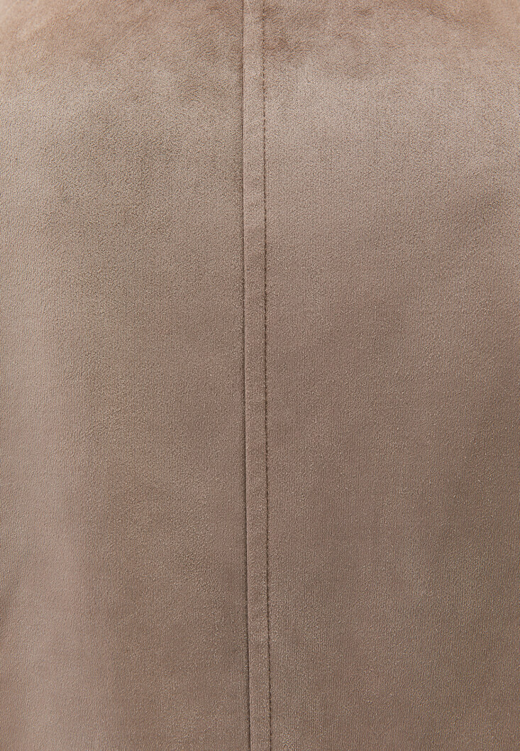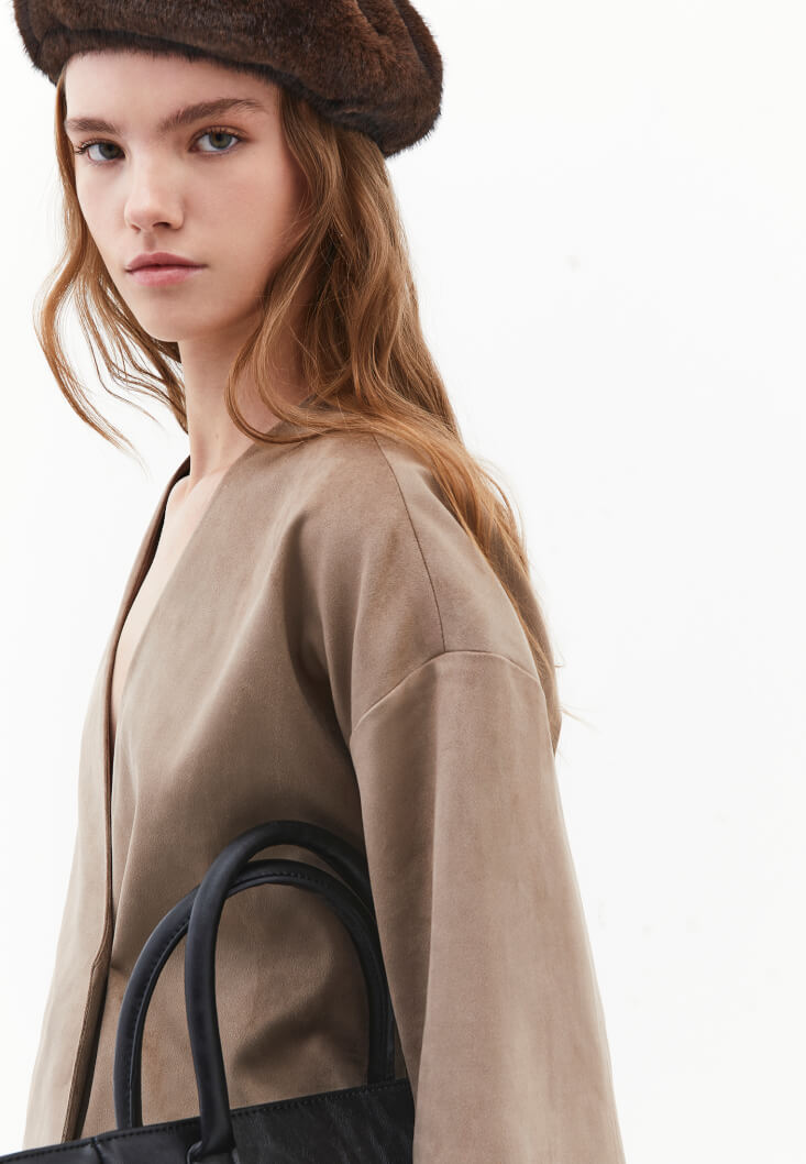 Vegan süet doku, bedenden uzak oversize fit, uzun kollu, içi astarlı, tasarım düğme detaylı, kruvaze yaka.