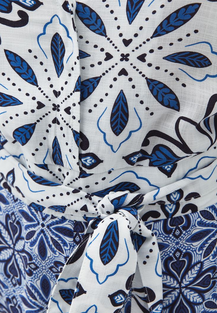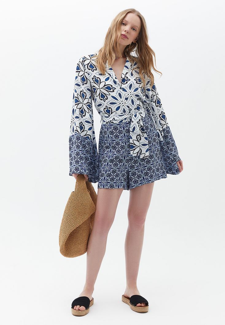 %100 viskon içerikli doku, desenli tasarım, kendi kumaşından kemerli, kruvaze yaka, ön kısmı şeffaf düğmeli, mini boy, uzun kollu, arka bel kısmı lastikli, bedene yakın fit.