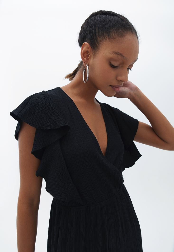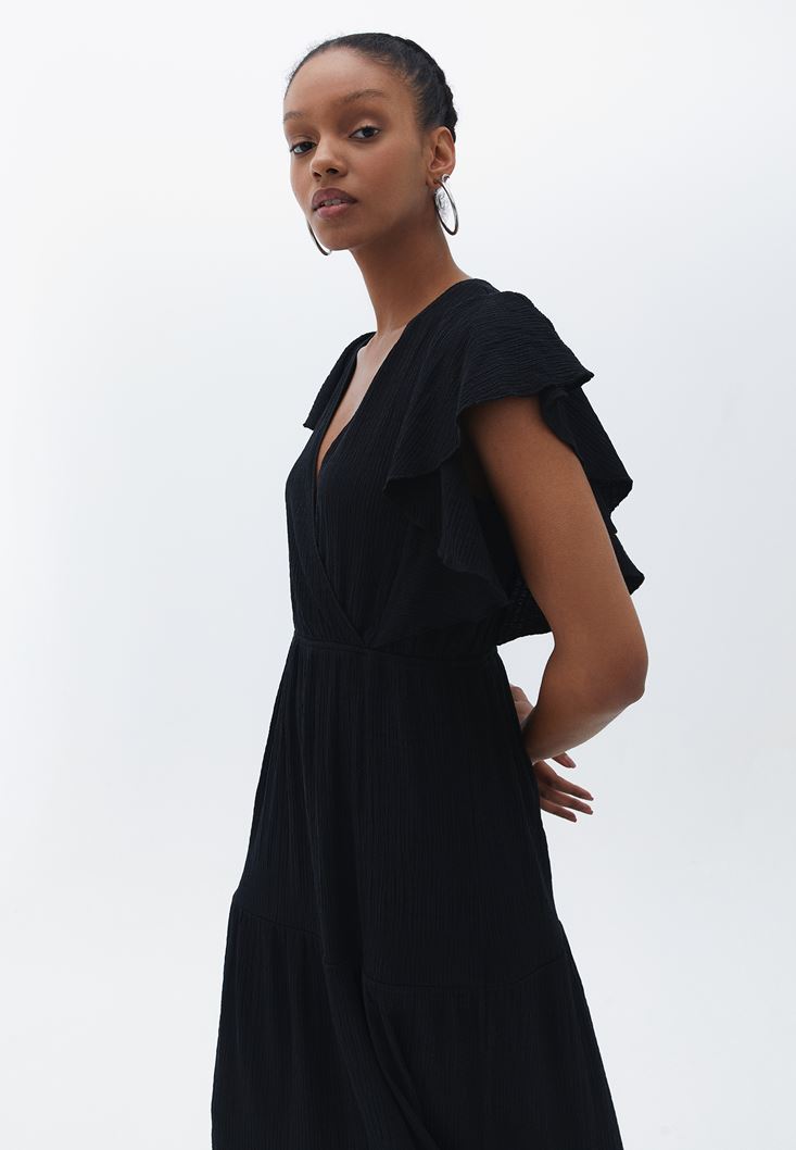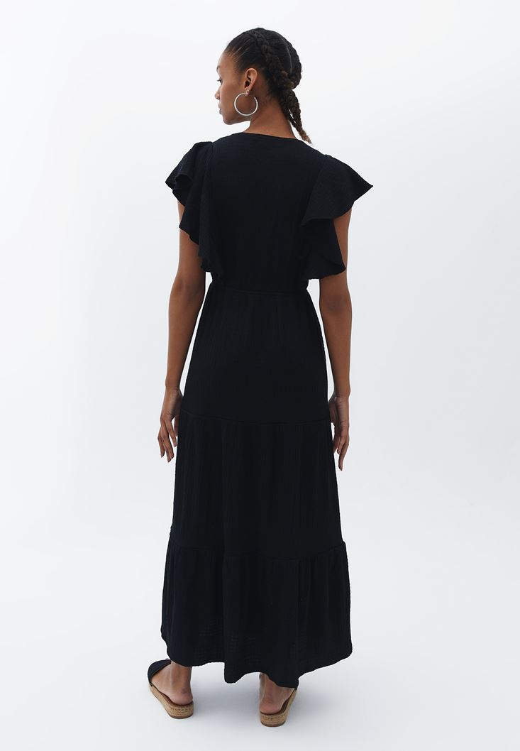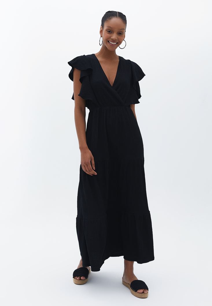 Siyah Kruvaze Yaka Uzun Elbise
