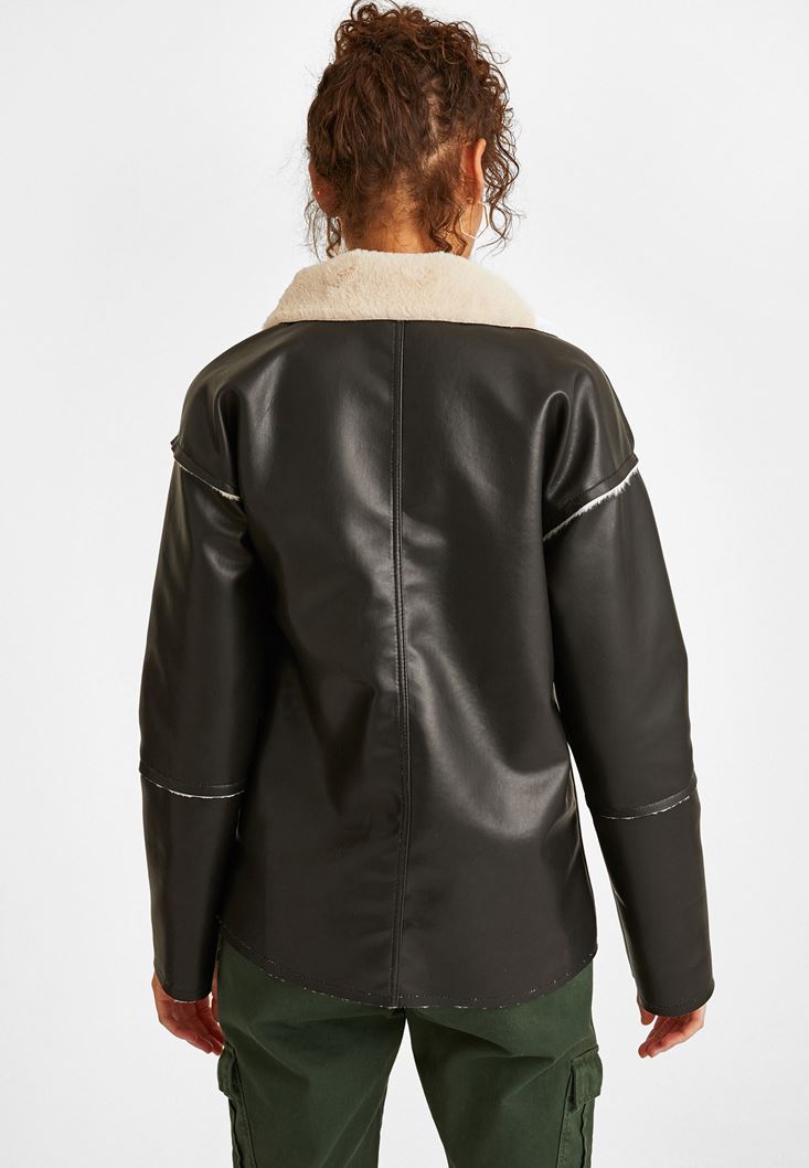 Siyah Kürk Detaylı Deri Ceket