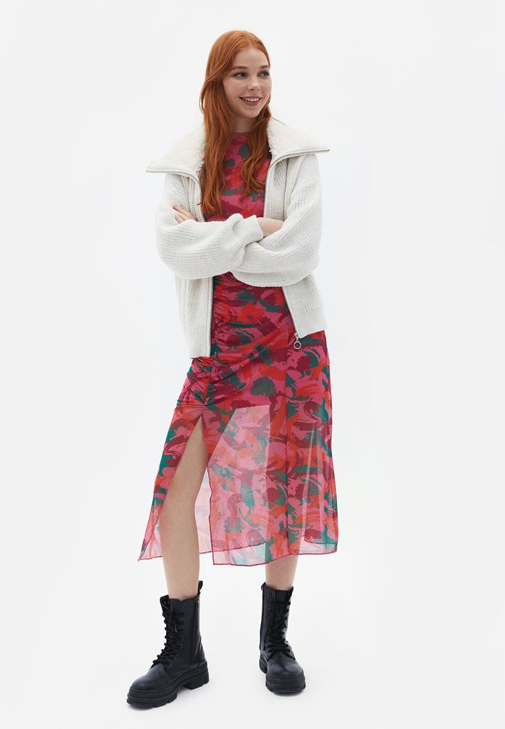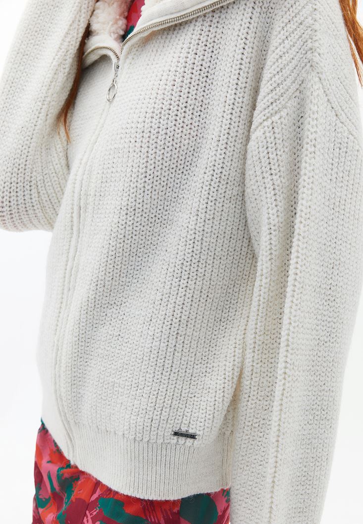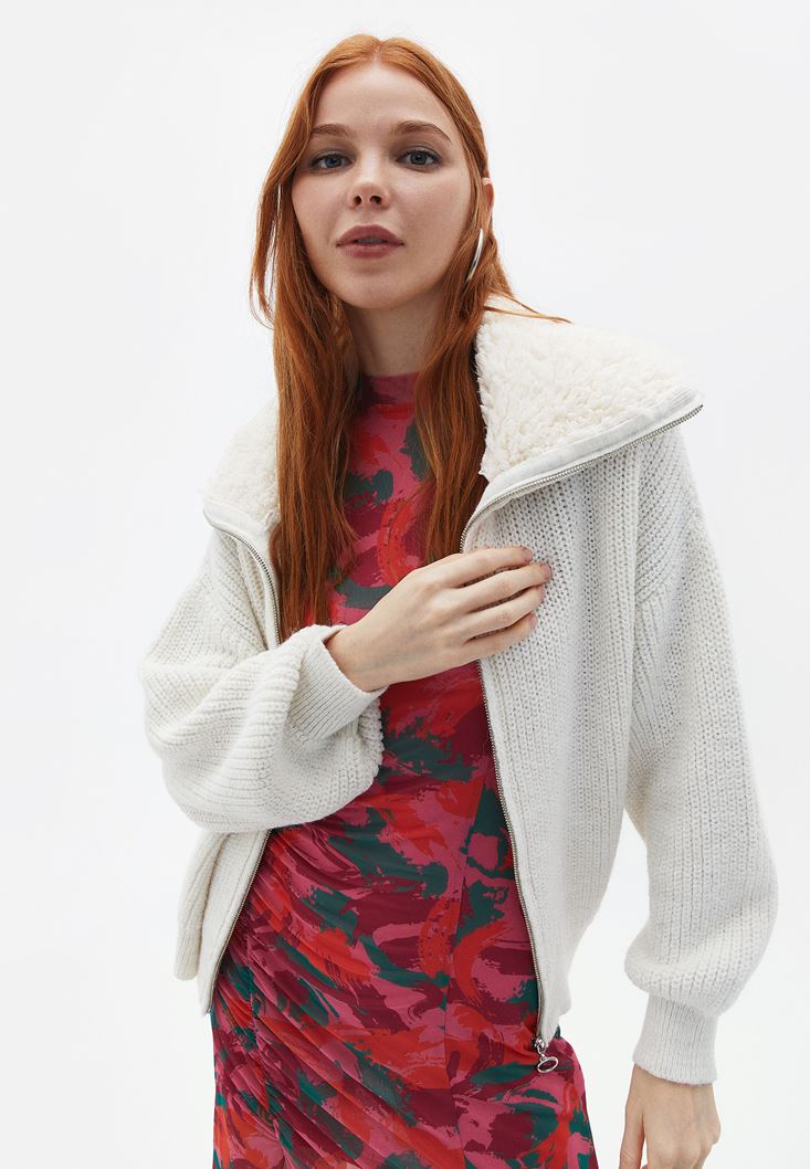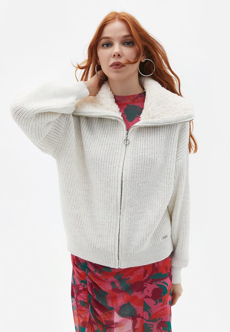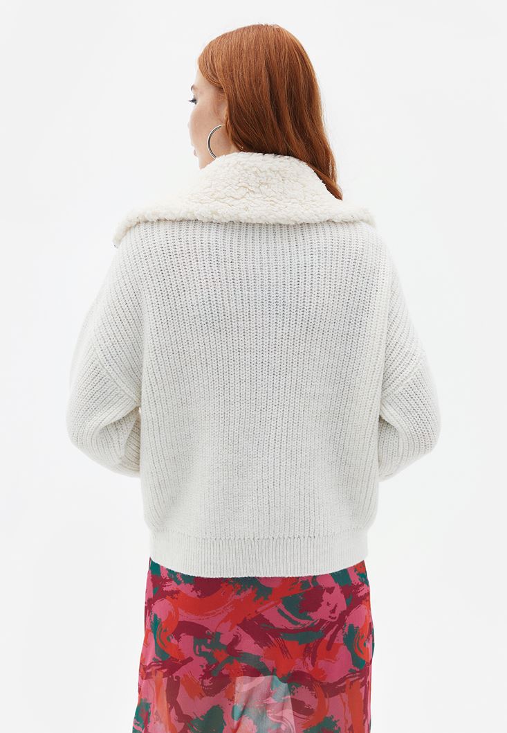 Vegan kürk yakalı, fitilli triko örgü, fermuar kapamalı, bedene yakın relax fit, polo yaka.