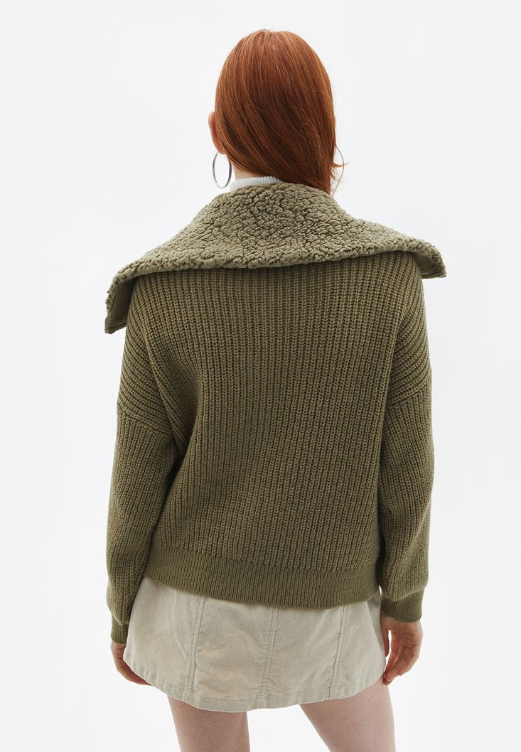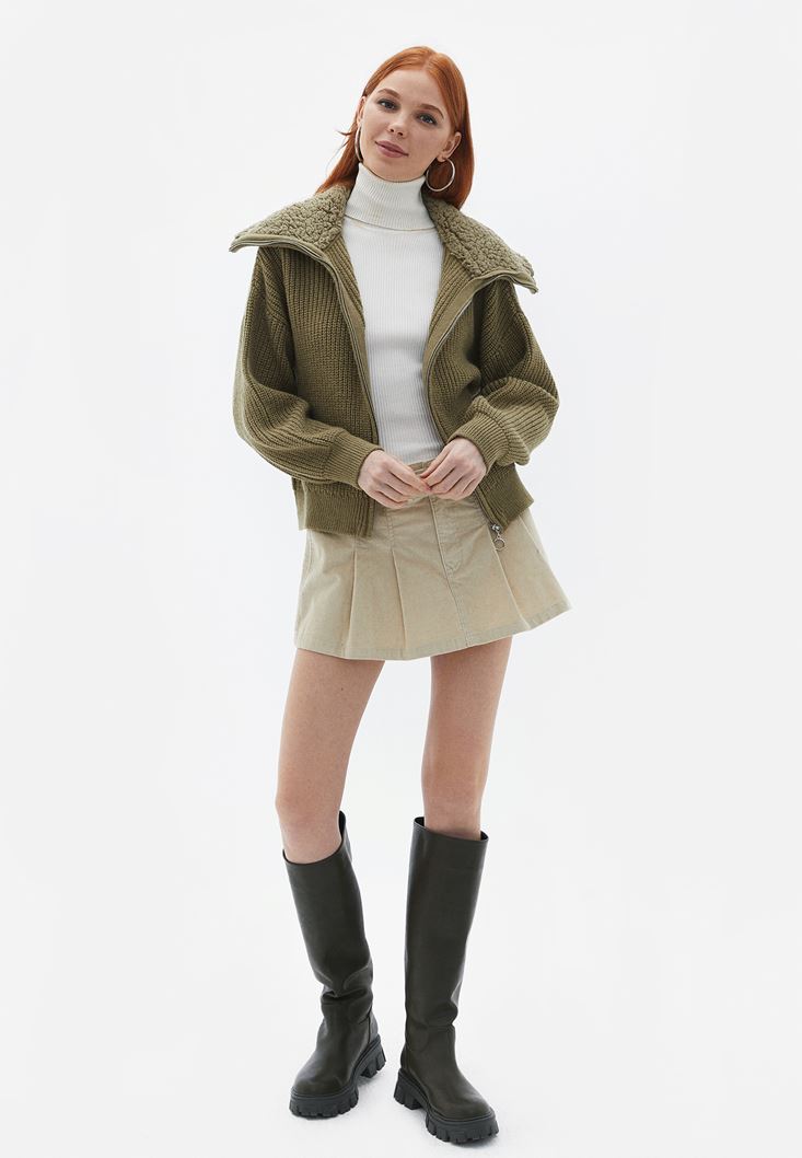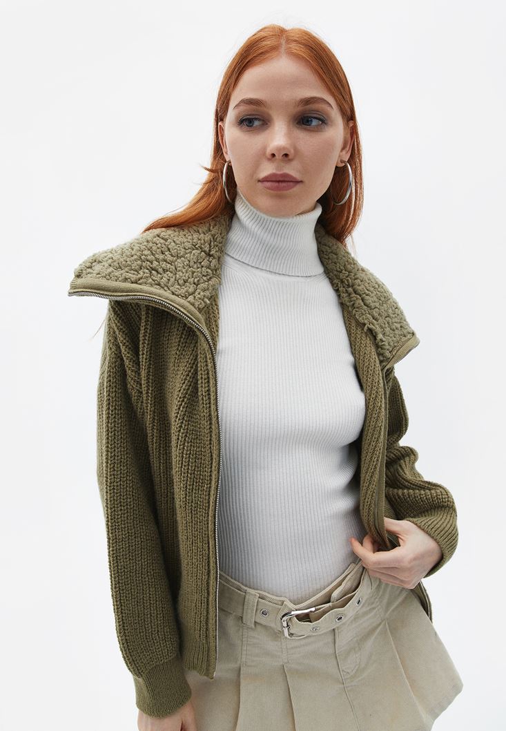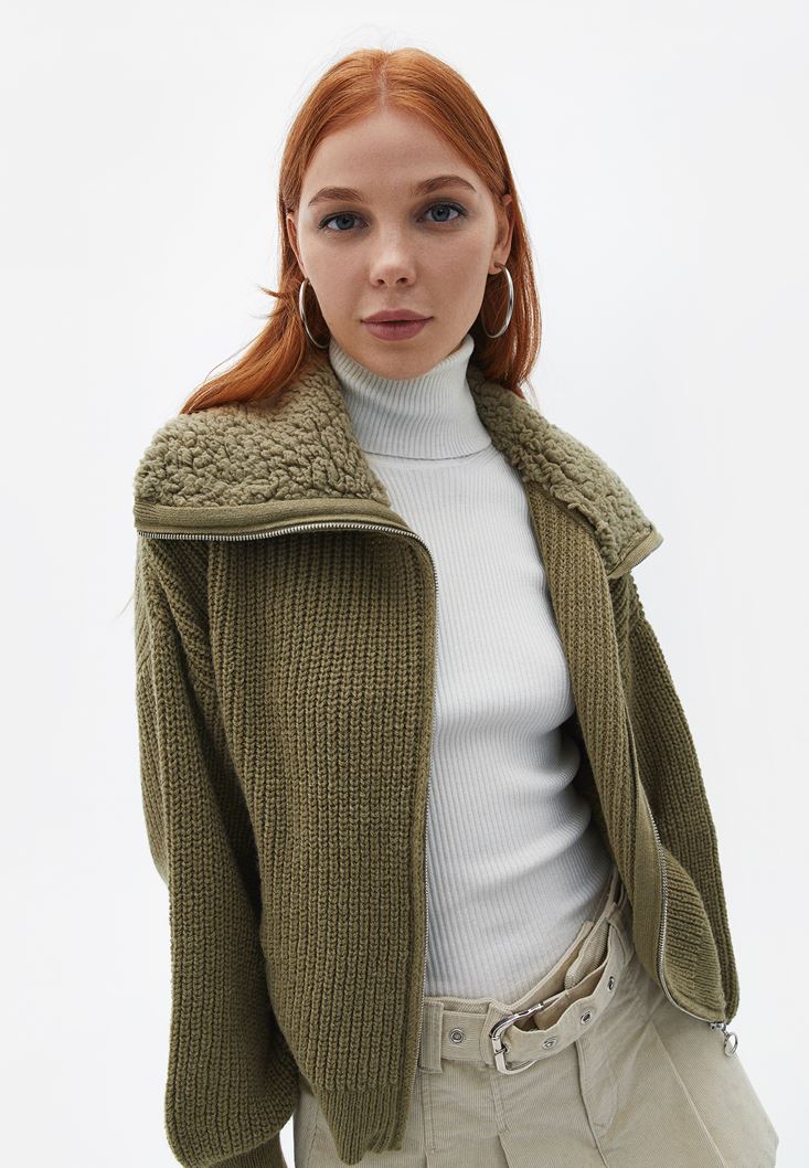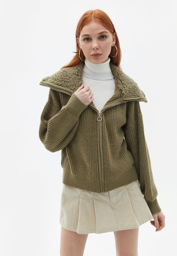 Vegan kürk yakalı, fitilli triko örgü, fermuar kapamalı, bedene yakın relax fit, polo yaka.