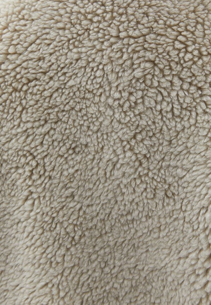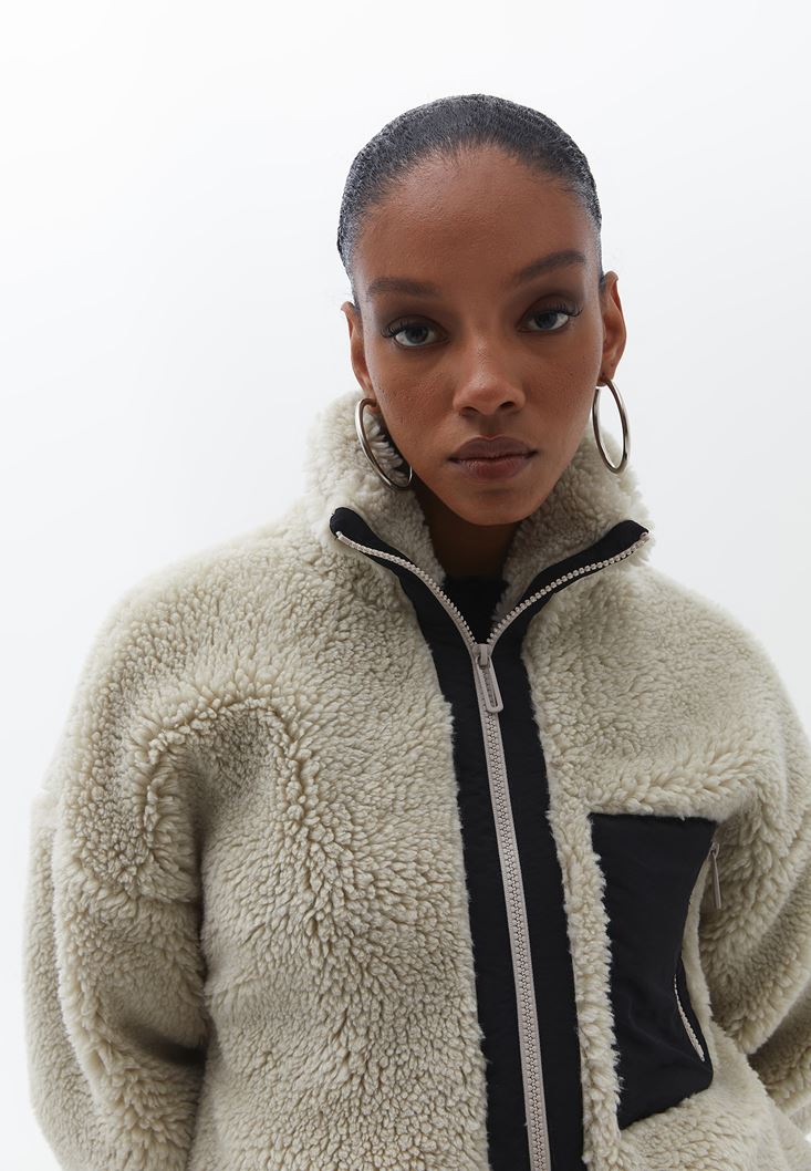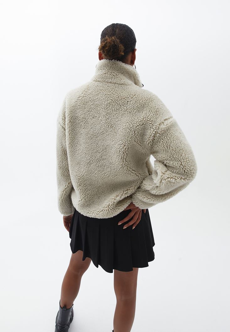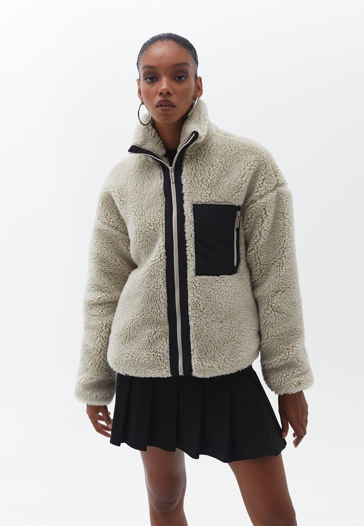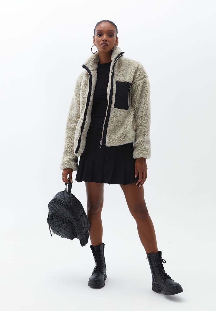 Vegan kürk doku, yüksek yaka, fermuar kapamalı, bedenden uzak oversize fit, ön kısmı fermuarlı cep detaylı, içi astarlı, iki yanı cepli.