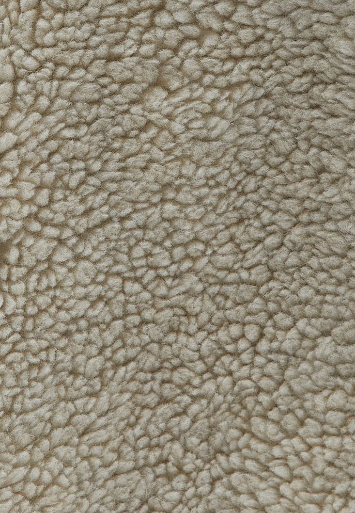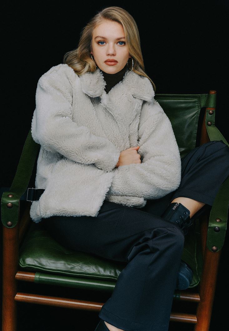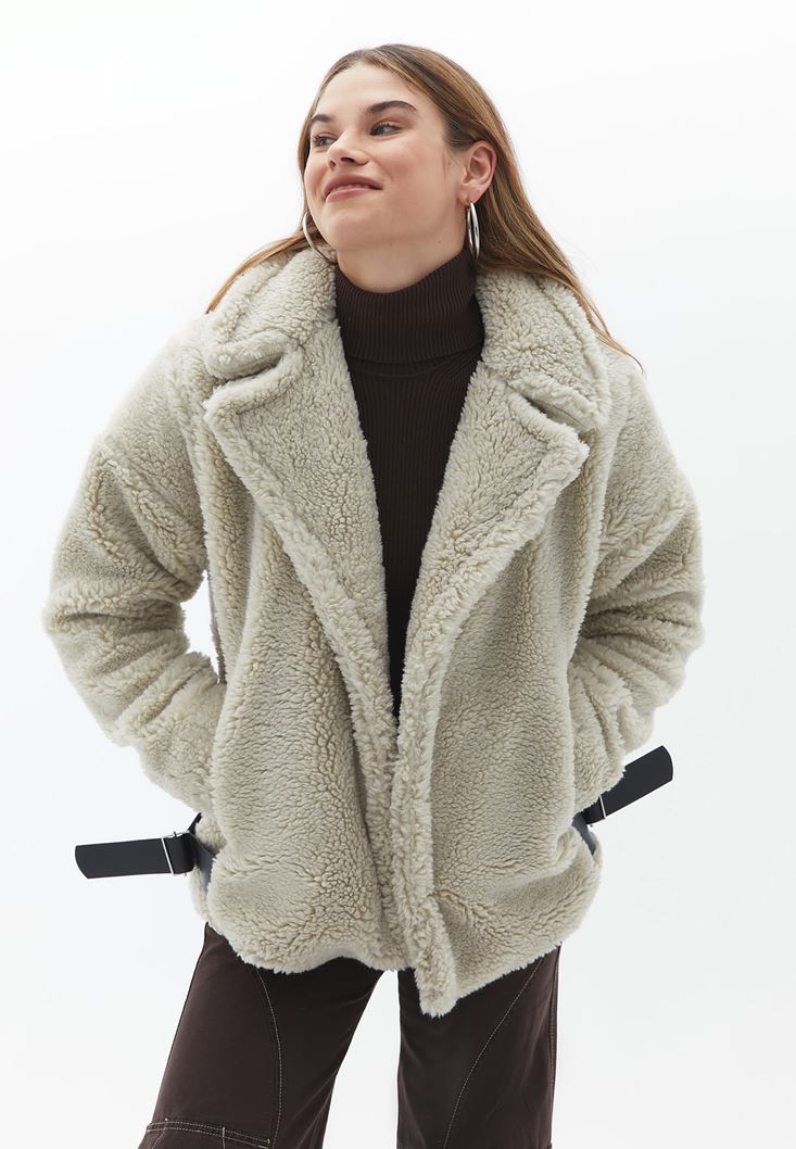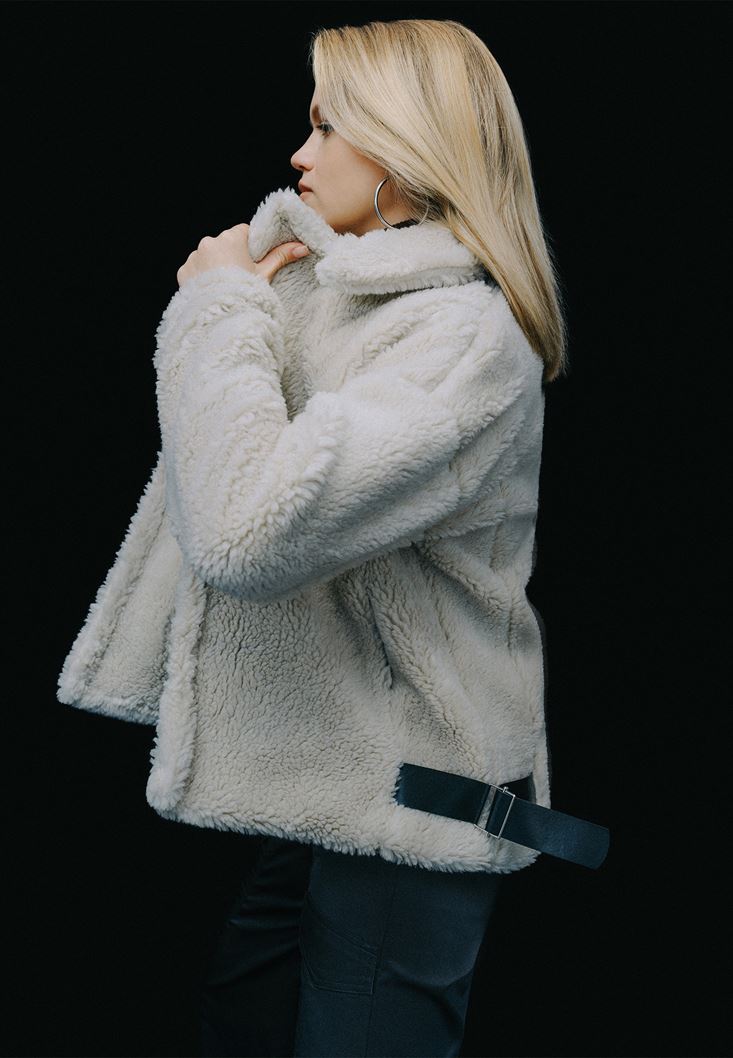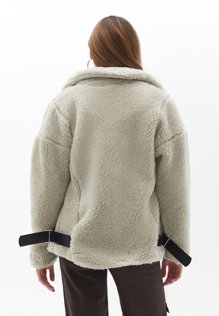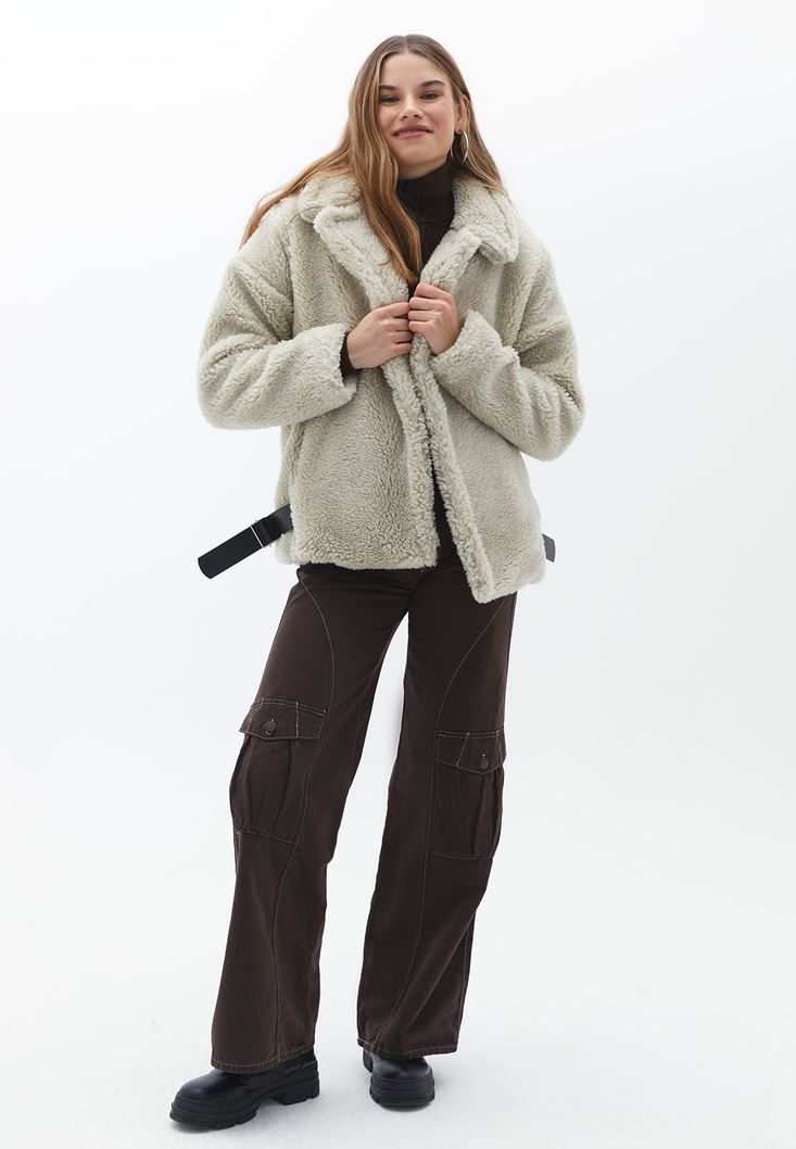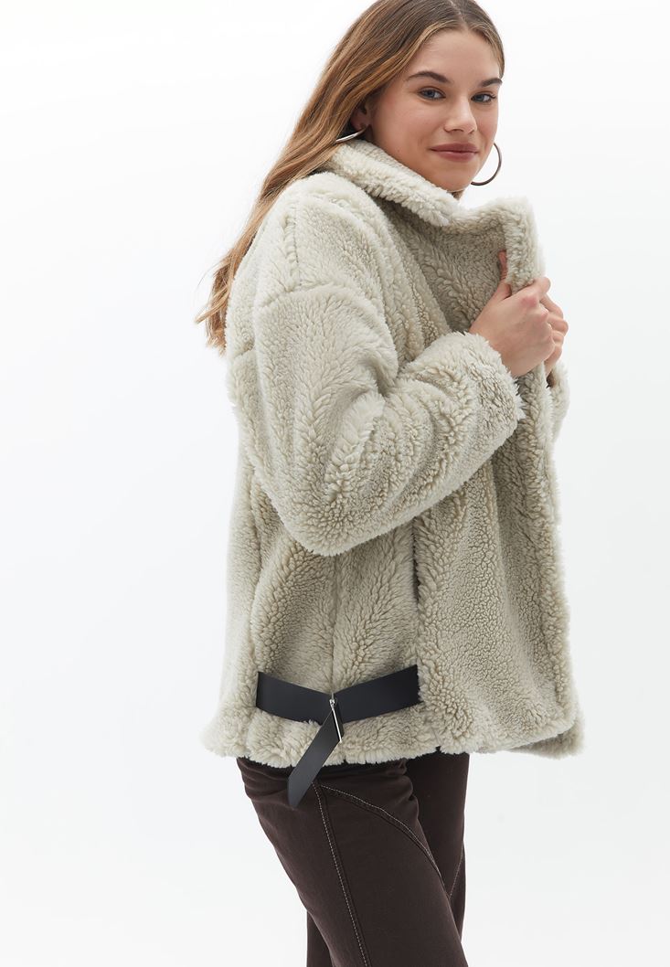 Vegan kürk doku, bedenden uzak oversize fit, içi astarlı, yan kısımları kemerli, önü iki cepli.