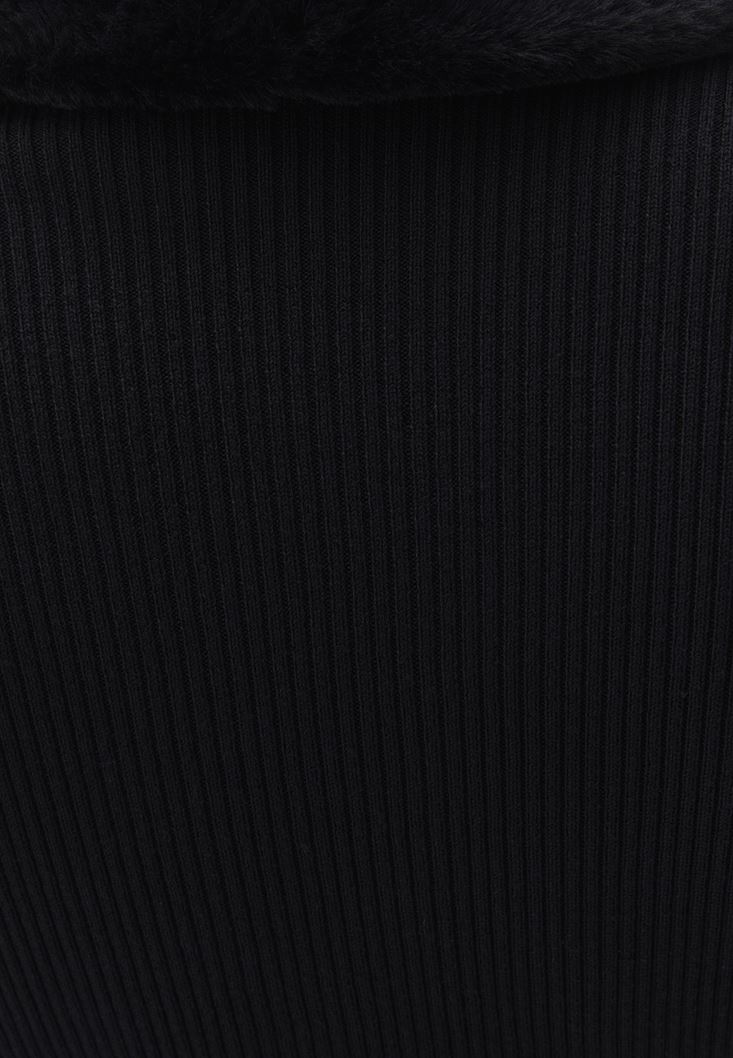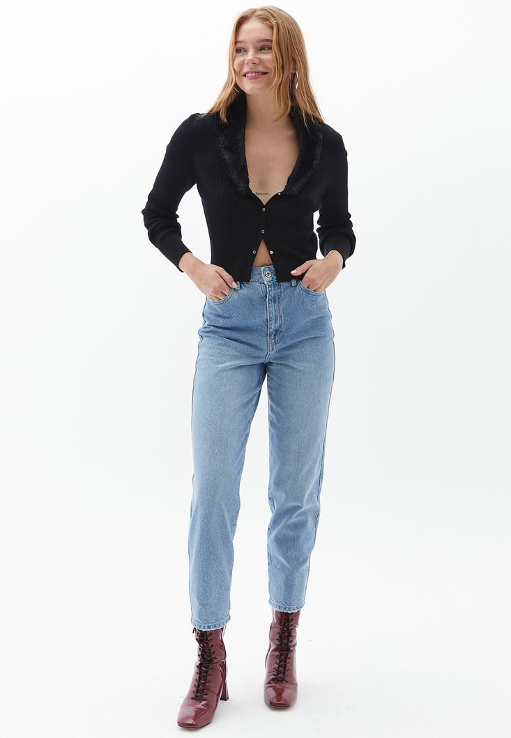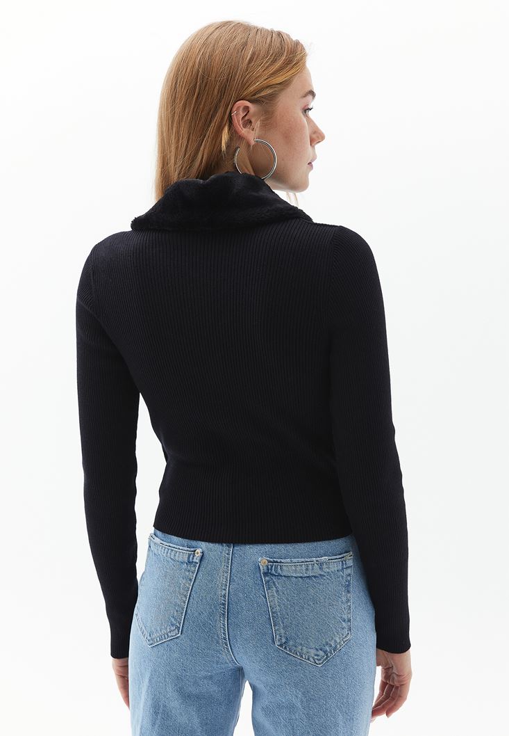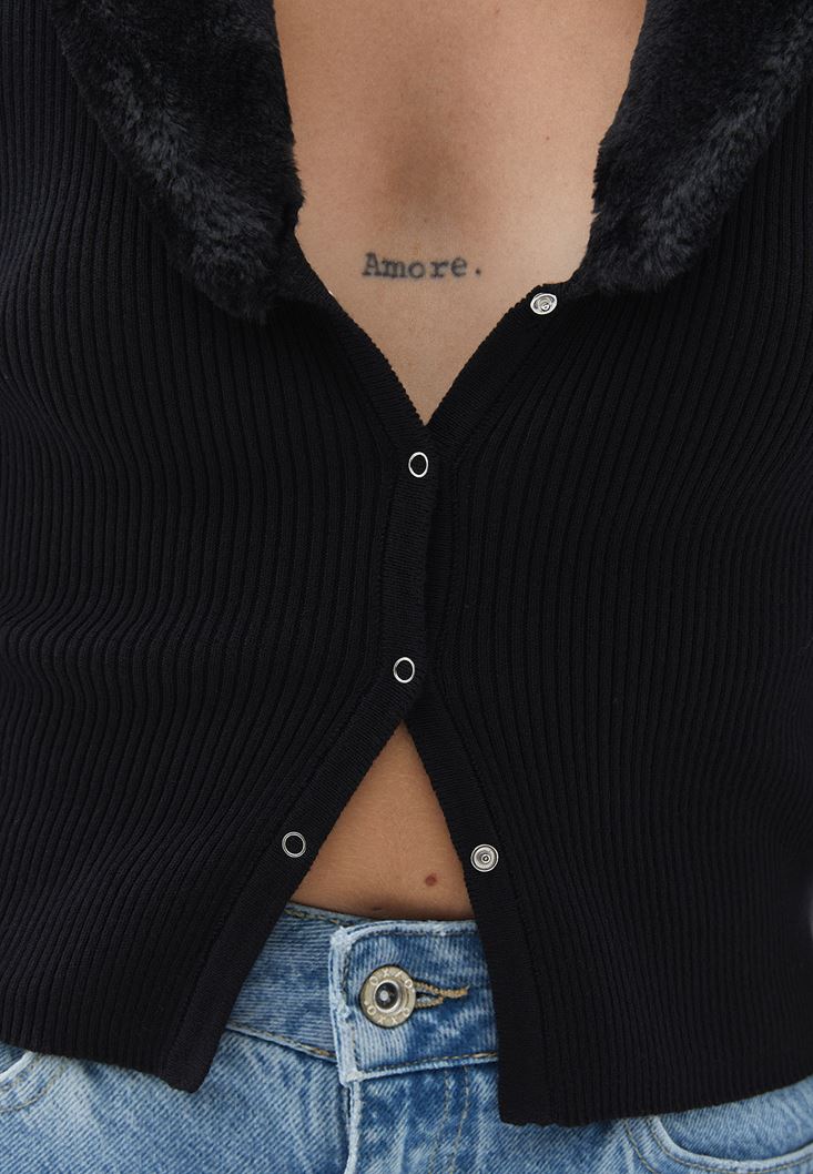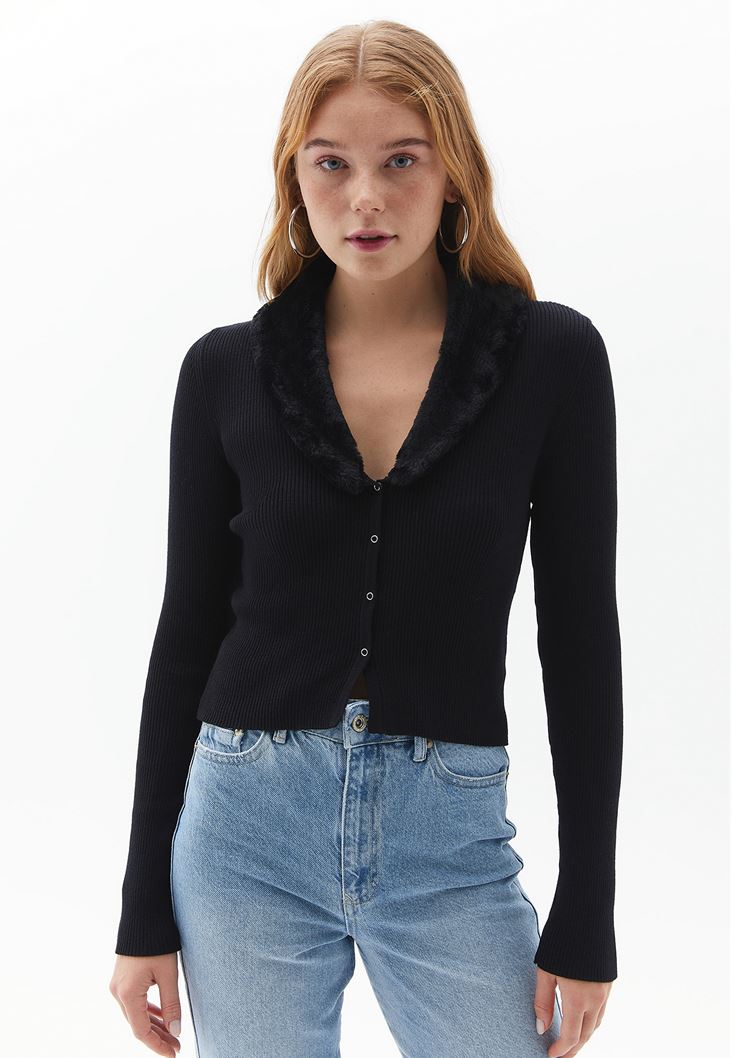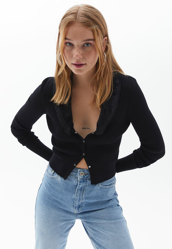 Siyah Kürk Yakalı Crop Triko Hırka