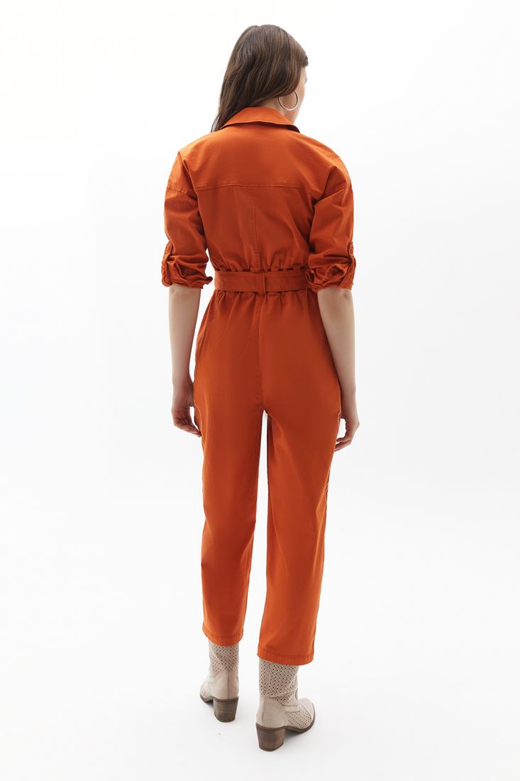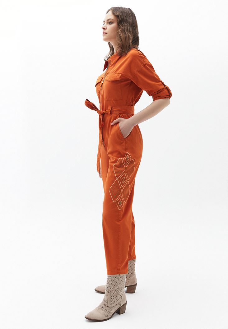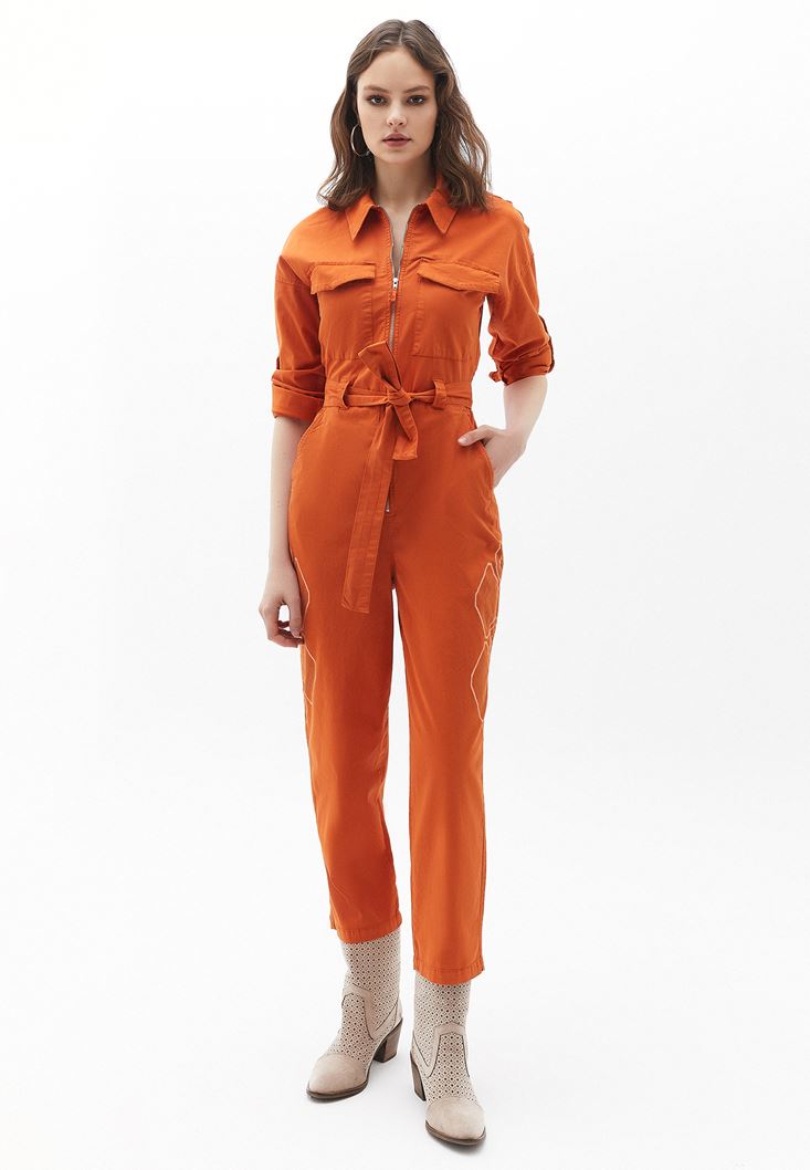 • Bayan Turuncu Kuşak Detaylı Pamuklu Tulum
