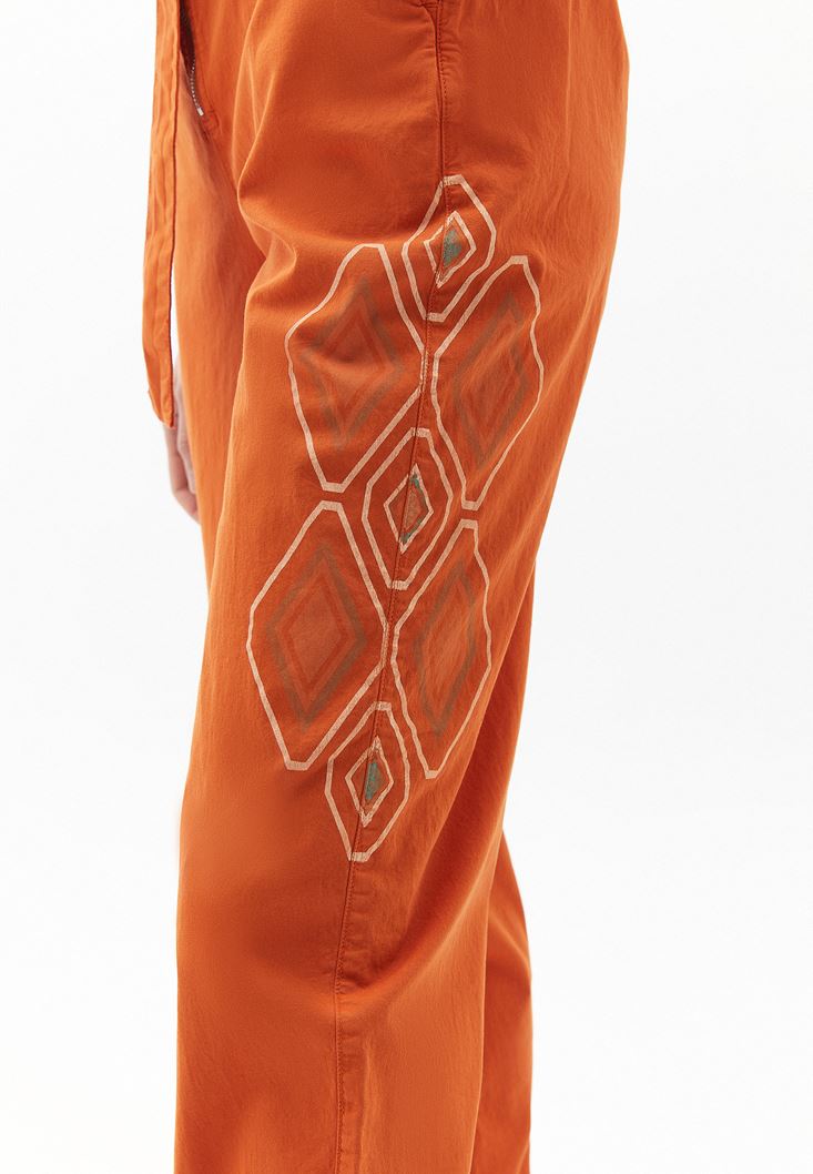 Pamuk içerikli doku, yüksek bel, uzun kollu, slim paça, gömlek yaka, ön kısmı fermuar kapamalı, kendi kumaşından kuşaklı, üst ve alt kısmı iki cepli, yan kısımları etnik desenli, bilekte biten paça boyu, kolu katlamalı ve düğmeli, arka bel kısmı lastikli.