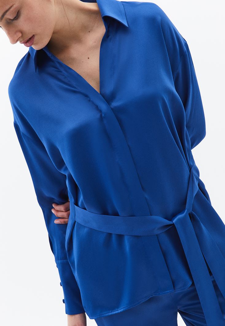 • Bayan Mavi Kuşak Detaylı Saten Gömlek