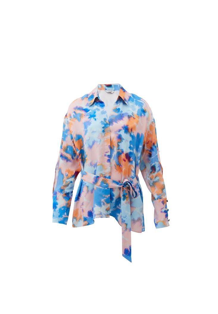 • Bayan Çok Renkli Kuşak Detaylı Saten Gömlek