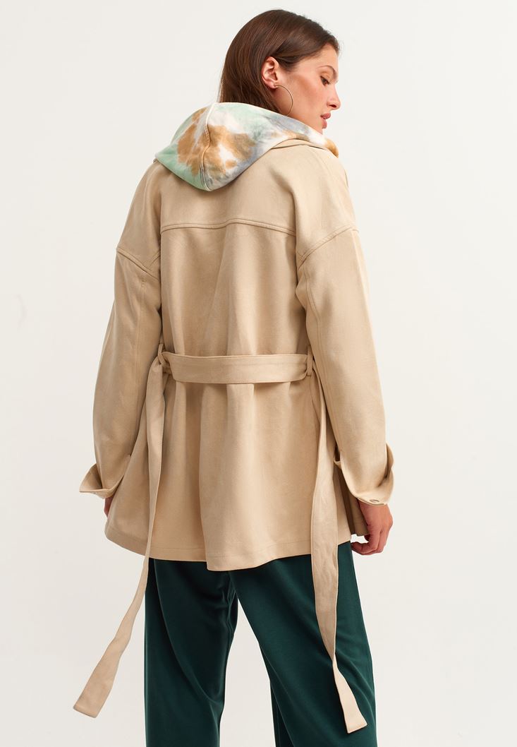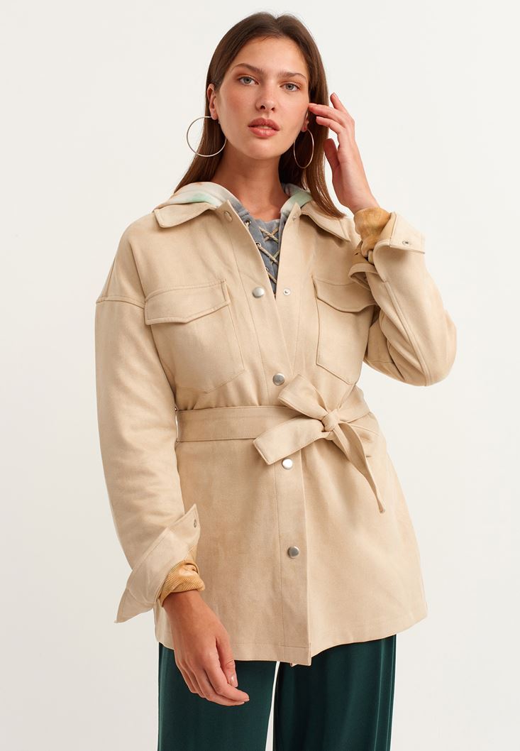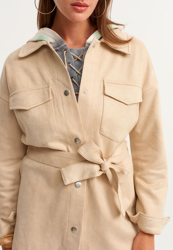• Bayan Bej Kuşak Detaylı Süet Ceket