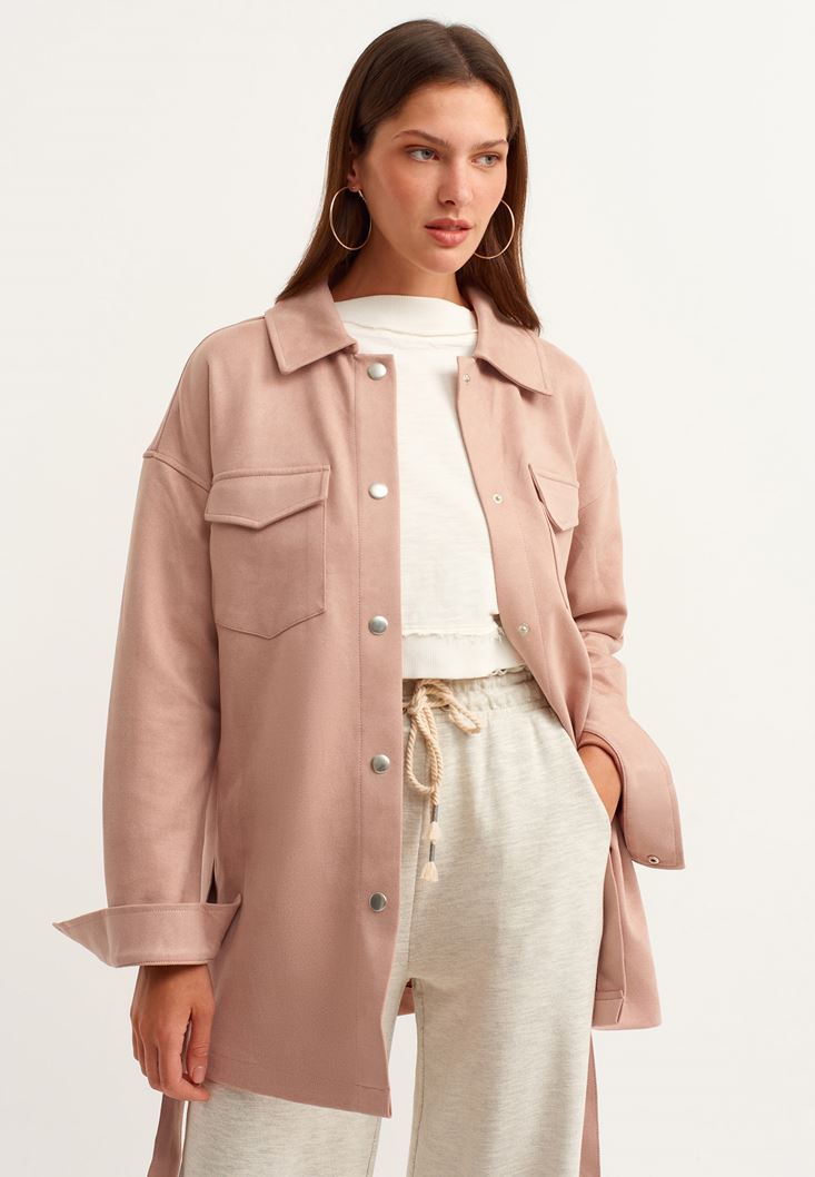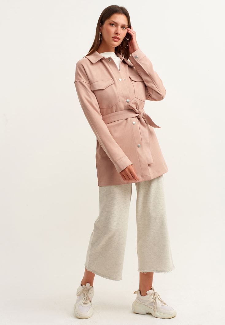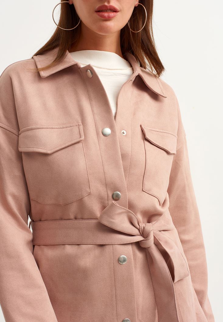 • Bayan Pembe Kuşak Detaylı Süet Ceket