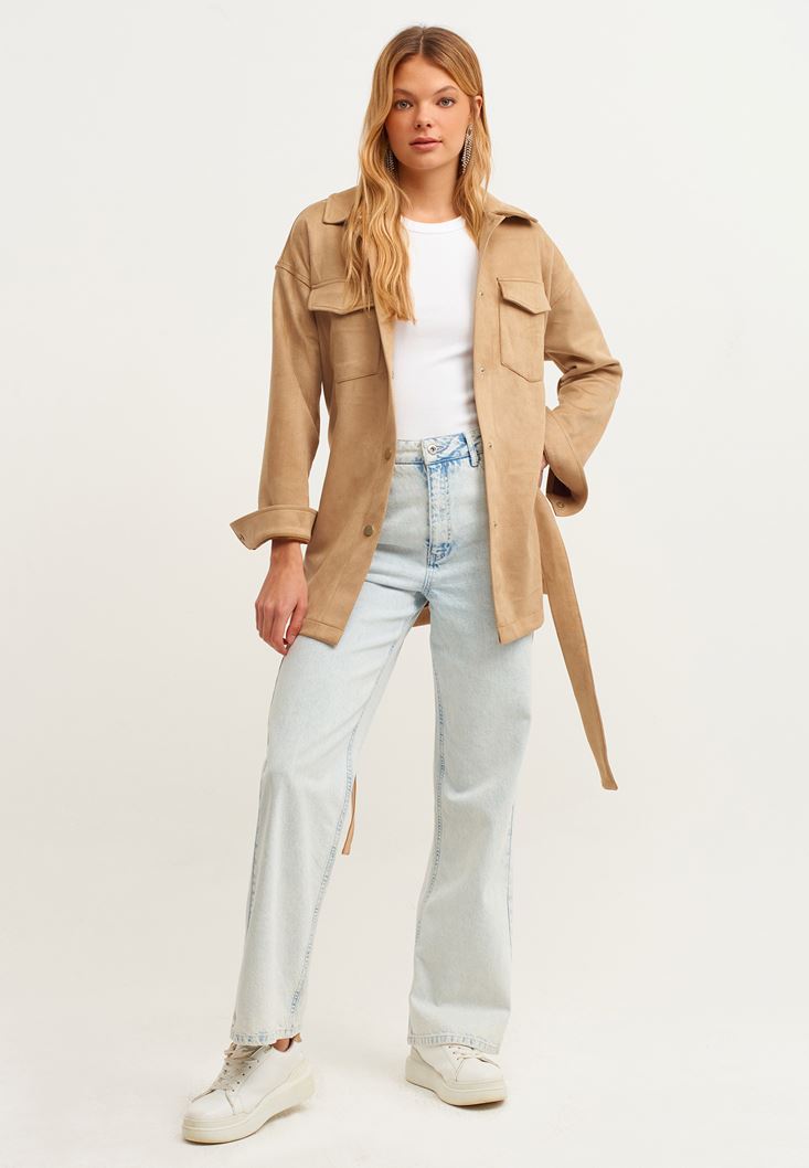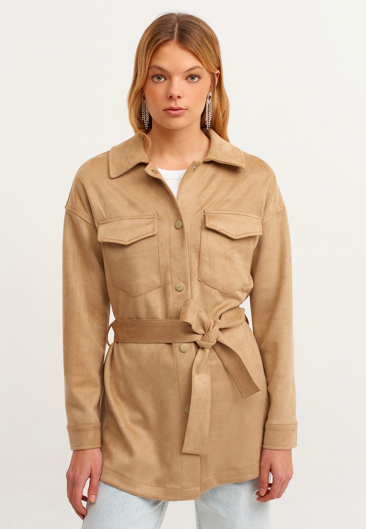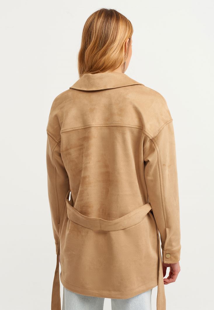 Kahverengi Kuşak Detaylı Süet Ceket
