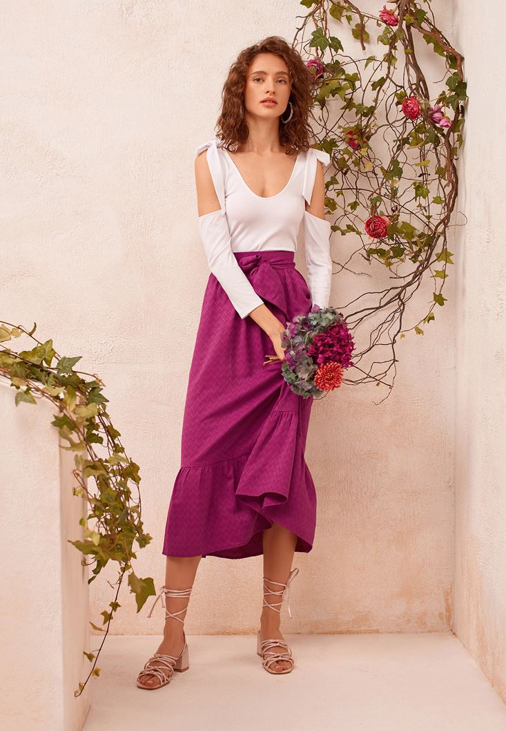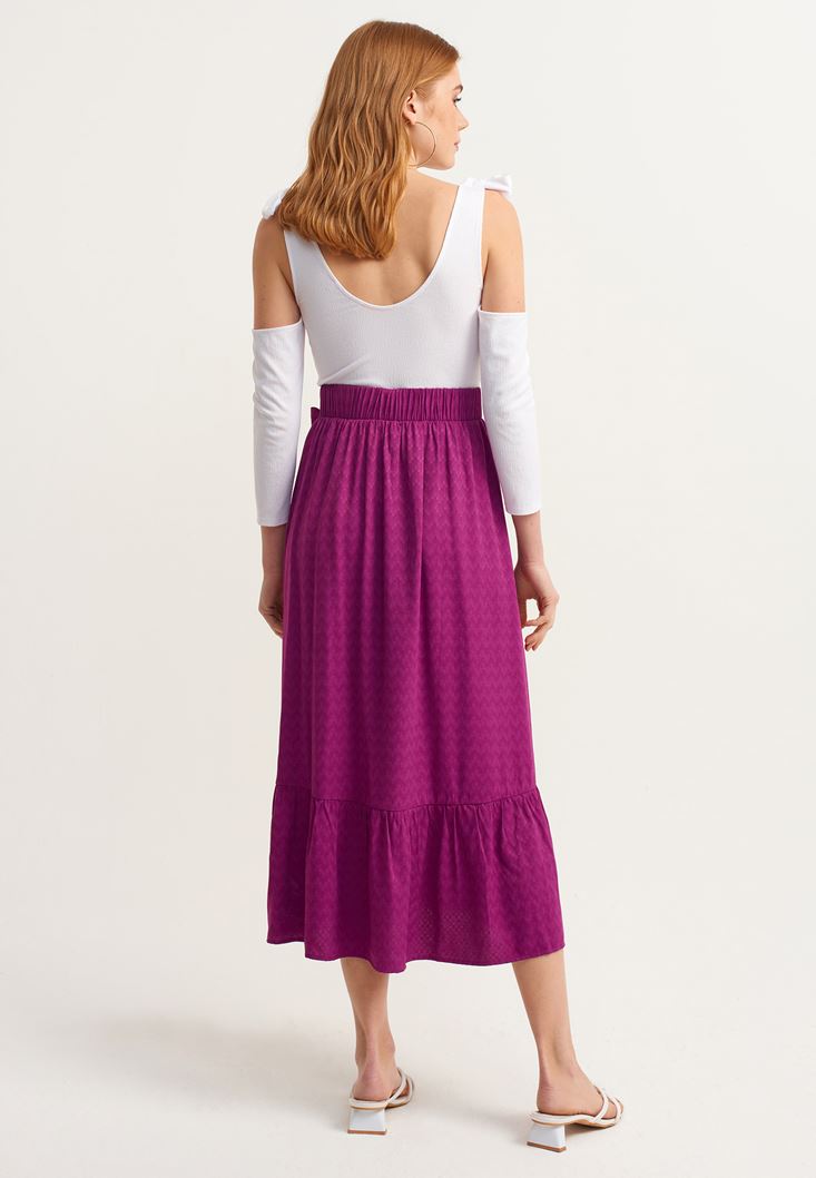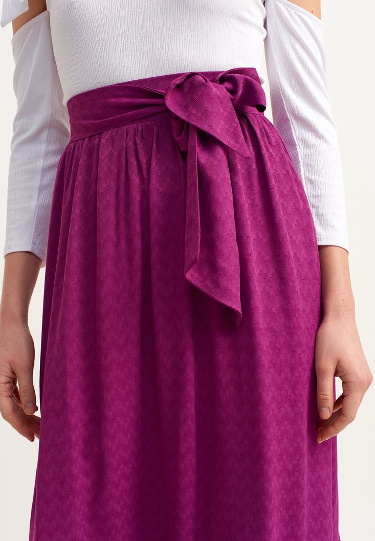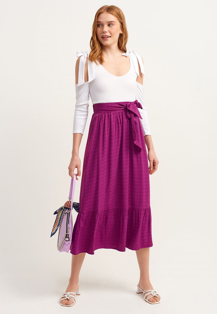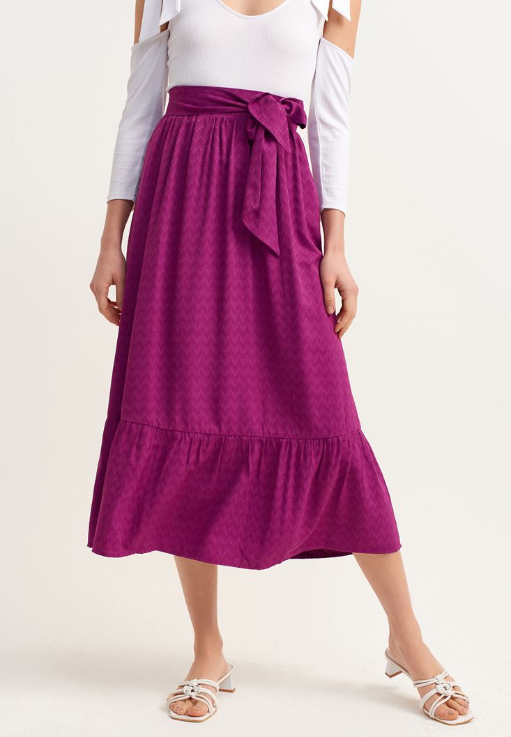 Viskon içerikli doku, belden kuşaklı, etek ucu volanlı, midi boy, yüksek bel, arka bel kısmı lastikli.
