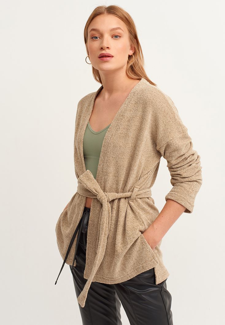 • Bayan Krem Kuşaklı Şönil Midi Hırka