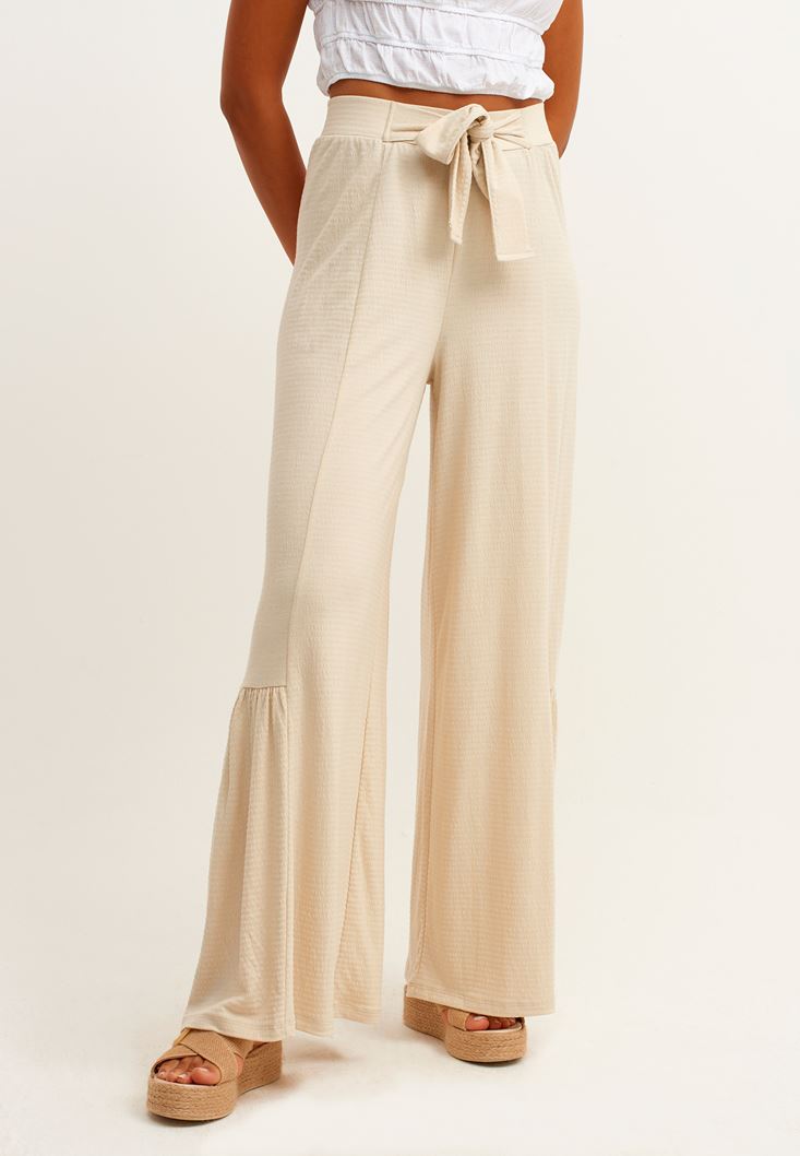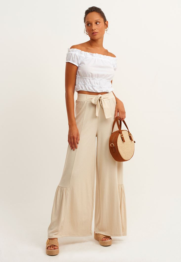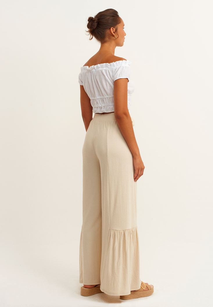 Açık Bej Kuşaklı ve Volanlı Wide-Leg Pantolon